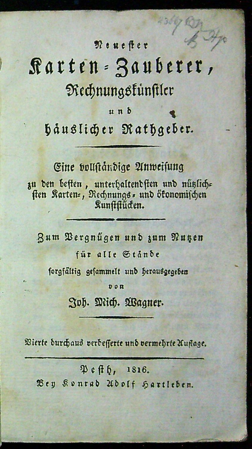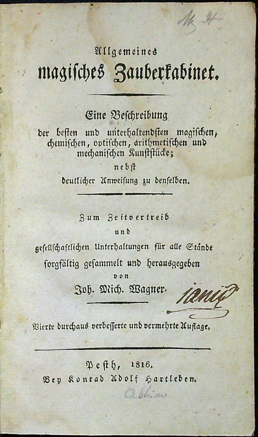 Allgemeines magisches Zauberkabinet. Eine Beschreibung der besten und unterhaltendsten magischen, chemischen, optischen, arithmetischen und mechanischen Kunststücke; deutlicher Anweisung zu denselben. Zum Zeitvertreib und gesellschaftlichen Unterhaltungen für alle Stände sorgfältig gesammelt und herausgegeben von ....