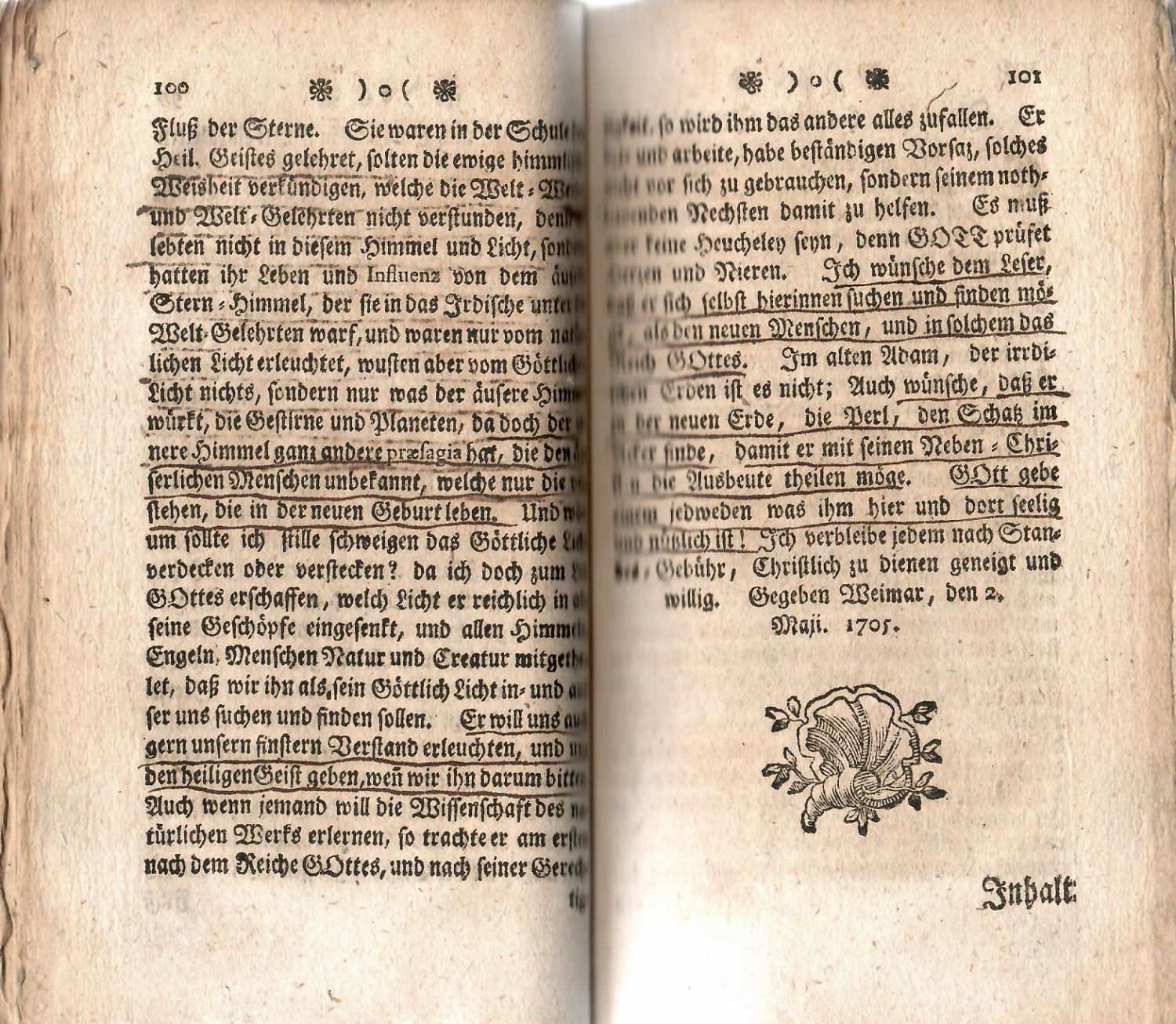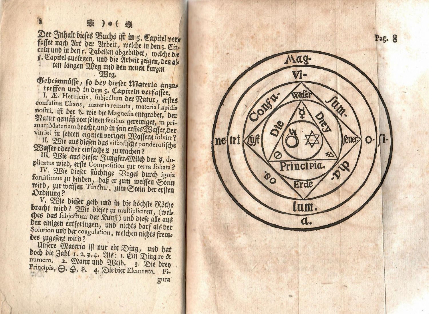 Holzmann-Bohatta II,7657; Brüning 3202; Bibliographie der alchem. Literatur, München 2006 Band II,4931.<br>Tištěno švabachem, latinská antikvou, signatury, stránkové kustody, uprostřed horního okraje stran nula v obrácených kulatých závorkách mezi drobnými tiskařskými ozdůbkami, arabská paginace stran při vnějším horním okraji. Vstupní pásové vlysy z ornamentů a korunou uprostřed, tučně tištěné plné iniciály ve výši 2-4 řádků, dvě viněty, koncové tiskařské ozdůbky. Mezi stranou 8-9 rozkládací do dřeva rytá tabule. Kniha se skládá ze tří děl se samostatnými titulními listy, průběžná paginace. Na straně 89 tit. list "II. Der Philosophische Perl=Baum, das Gewächte der drey Principien, zu Deutlicher Erklärung des Steins der Weisen, Wie er mit seinen Wurzeln in der aussern und finstern Welt, mit seiner Blüte aber in der Paradiesischen= und Licht=Welt, und mit seiner reifen Frucht in der Englischen und Himmlischen Welt stehet und wächset. Beschrieben durch D.I.W.", na straně 241 "III. Schlüsel zu dem CABINET der geheinen Schatz=Cammer der Natur, Zu Such= und Findung des Steins der Weisen, durch Fragen und Antwort gestellet, Verfertiget und der Welt gezeiget durch D.I.W.".<br>Pergamenová vazba z ateliéru Krupka, ochranné kartonové pouzdro potažené mramorovaným papírem z téhož ateliéru. Knižní blok neoříznutý, v textu tu a tam drobné hnědé skvrnky, místy dobově podtrháváno černým perem. Na rubu tit. listu staré razítko z 19. století "Bibl. d.v. z. R.(ostock)" a na konci razítko z počátku 20. století "Bibliothek der Vereinten zu Rostock" (razítka zednářské lóže "Irene zu den drei Sternen v pomořanském Rostocku).<br>Dorothea Juliana Wallich (1657 Výmar - 1725 Arnstadt) durynská alchymistka, jedna z mála žen, které se zabývaly alchymií. V letech 1705 až 1706 publikovala tři alchymistické knihy pod iniciálami D.I.W. Christoph Schmieder ve svých dějinách alchymie nevylučuje možnost, že vydala pod svým jménem pouze rukopisy svého otce, ale zároveň pokládá za možné, že je autorkou skutečně ona sama. Nabízené dílo je výsledkem práce autorky s rudami obsahujícími kobalt a jsou zaměřené na výrobu kamene mudrců, který měl přeměnit olovo a cín ve zlato a stříbro, autorka také popisuje různé chemické experimenty se sloučeninami kobaltu. Brüning ve své bibliografii alchym. literatury také zmiňuje jako možného autora Jacoba Waitze (3. 8. Schmalkalden 1641 - 1723), německý lékař, starosta města a výběrčí daní ve městě Gotha, člen učené akademie "Leopoldina". Zabýval se též alchymií a pracoval na výrobě tajného inkoustu. S autorkou pravděpodobně připravil první knihu o minerálním lepku. - Nabízená kniha obsahuje všechny tři autorčiny práce samostatně vydané roku 1705 a 1706.<br>Nabízená kniha pochází ze sbírky profesora Jaroslava Bauera (18.6. 1920 Křešice u Litoměřic - 29.1. 1995 Praha), významného mineraloga, chemika, geologa a vysokoškolského profesora, který byl jmenován profesorem mineralogie až v roce 1990 (z politických důvodů) na VŠCHT. Profesor Bauer se též zajímal o alchymii.