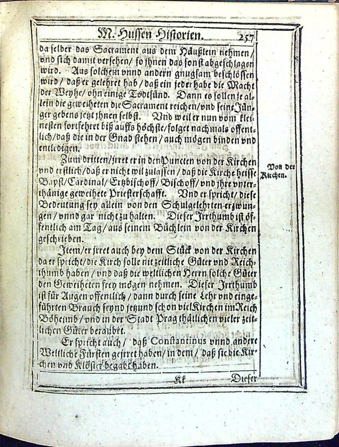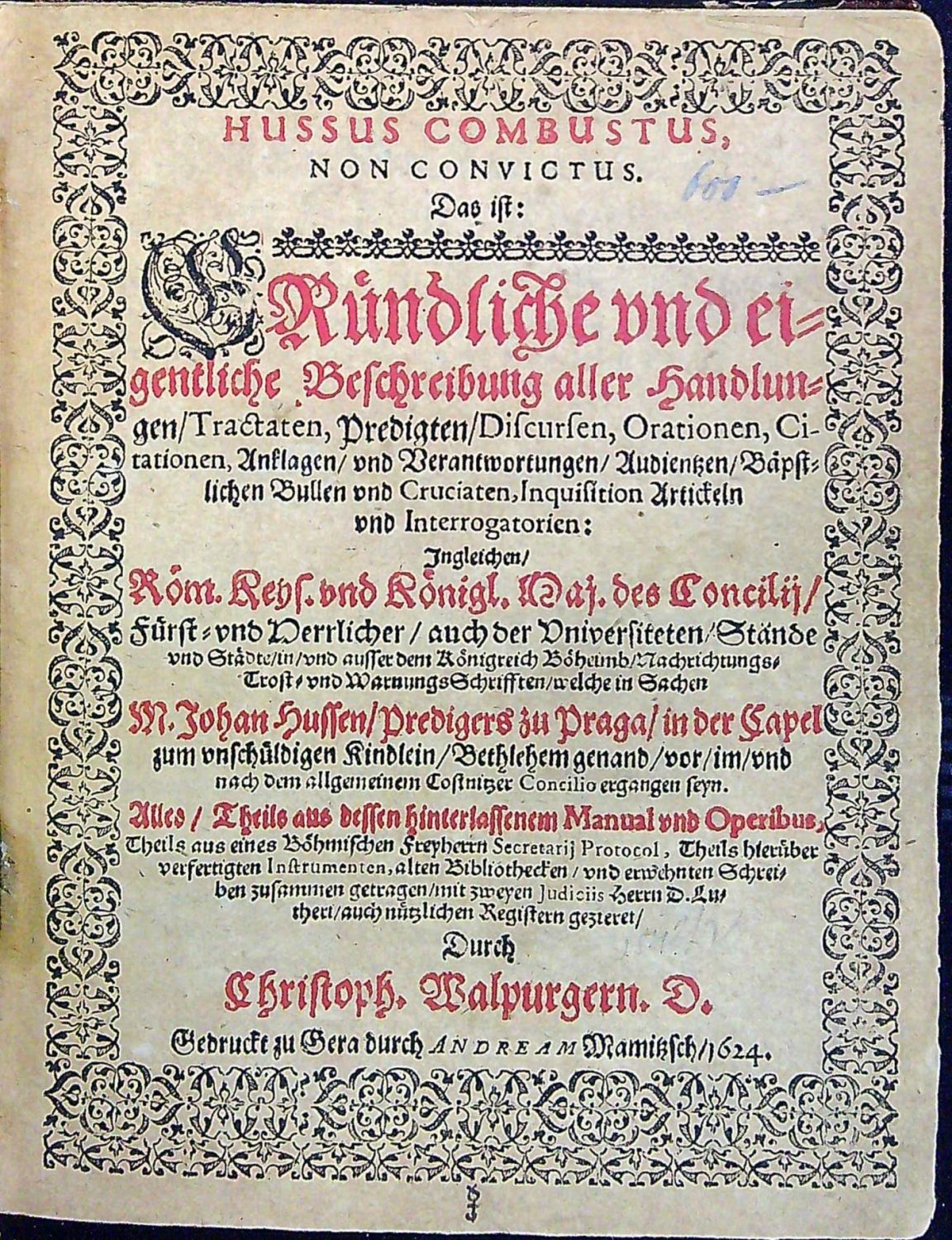 HUSSUS COMBUSTUS, NON CONVICTUS. Das ist: GRündliche und eigentliche Beschreibung aller Handlungen/ Tractaten, Predigten/ Discursen, Orationen, Citationen, Anklagen/ und Verantwortungen/ Audientzen/ Bäpstlichen Bullen und Cruciaten, Inquisition Artickeln und Interrogatorien: Ingleichen/ Röm. Keys. und Königl. Maj. des Concilij/ Fürst = und Herrlicher/ auch der Universiteten/ Stände und Städte/ in/ und ausser dem Königreich Böheimb/ Nachrichtungs = Trost = und Warnungs Schrifften/ welche in Sachen M. Johan Hussen/ Predigers zu Praga/ in der Capel zum unschüldigen Kindlein/ Bethlemen genand/ vor/ im/ und nach dem allgemeinem Costnitzer Concilio ergangen seyn. Alles/ Theile aus dessen hinterlassenem Manual und Operibus, Theils aus eines Böhmischen Freyherrn Secretarij Protocol, Theils hierüber verfertigten Instrumenten, alten Bibliothecken/ und erwehnten Schreiben zusammen getragen/ mit zweyen Judiciis Herrn D. Lutheri/ auch nützlichen Registern gezieret/ Durch ....