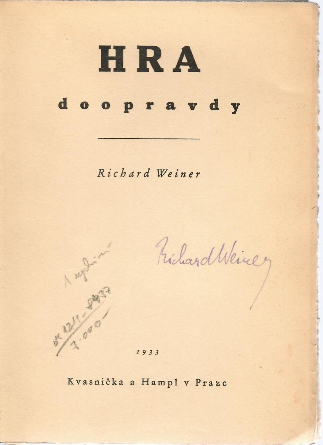 Na titulním listu podpis autora. Papírová obálka ohmataná, zažloutlá, při okrajích lehce pomačkaná. Při horním okraji hřbetu natržená, při spodním okraji hřbetu skvrna od tekutiny. Knižní blok volně vložený v obálce. Listy neoříznuty.