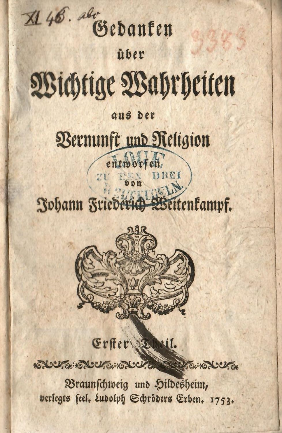 Tištěno švabachem, latinský text antikvou, řecký alfabetou, živá záhlaví, viněty, v záhlaví úvodních stran jednotlivých dílů vlysy, plné tučně tištěné iniciály ve výši 3-5 řádků, plné iniciálky zasazené do ornamentálních rámců s korunkou. První a třetí díl první vydání, druhý díl 2. vylepšené vydání. - Dobová kartonová vazba s deskami potaženými světle červeným škrobovým papírem, při horním okraji hřbetu dobový černý kožený štítek s tlačeným názvem, při spodním okraji hřbetu pap. knih. štítek s evidenčním číslem (knihovny zednářské lóže), barvená svrchní ořízka. Vazba ohmataná a místy odřená, kožený štítek ve hřbetu při horním vnějším okraji utržený, naražené rohy. Na titulním listu 1. dílu staré razítko berlínské zednářské lóže "Loge zu den drei Weltkugeln", na rubu tit. listu ex libris stejné lóže s ev. číslem.<br>Johann Friedrich Weitenkampf (7.7. 1726 Königsberg - 9.4. 1758 Braunschweig) německý filosof a luteránský pastor. Studoval nejprve na universitě v Královci, kde se setkal s I. Kantem, později v Lipsku, v Halle a nakonec v Helmstedtu, kde od roku 1750 přednášel. Nabízené dílo je jeho nejvýznamnějším, I. Kant přes některé kritické výhrady převzal některé Weitenkampfovy teze do své "Kritiky čistého rozumu".