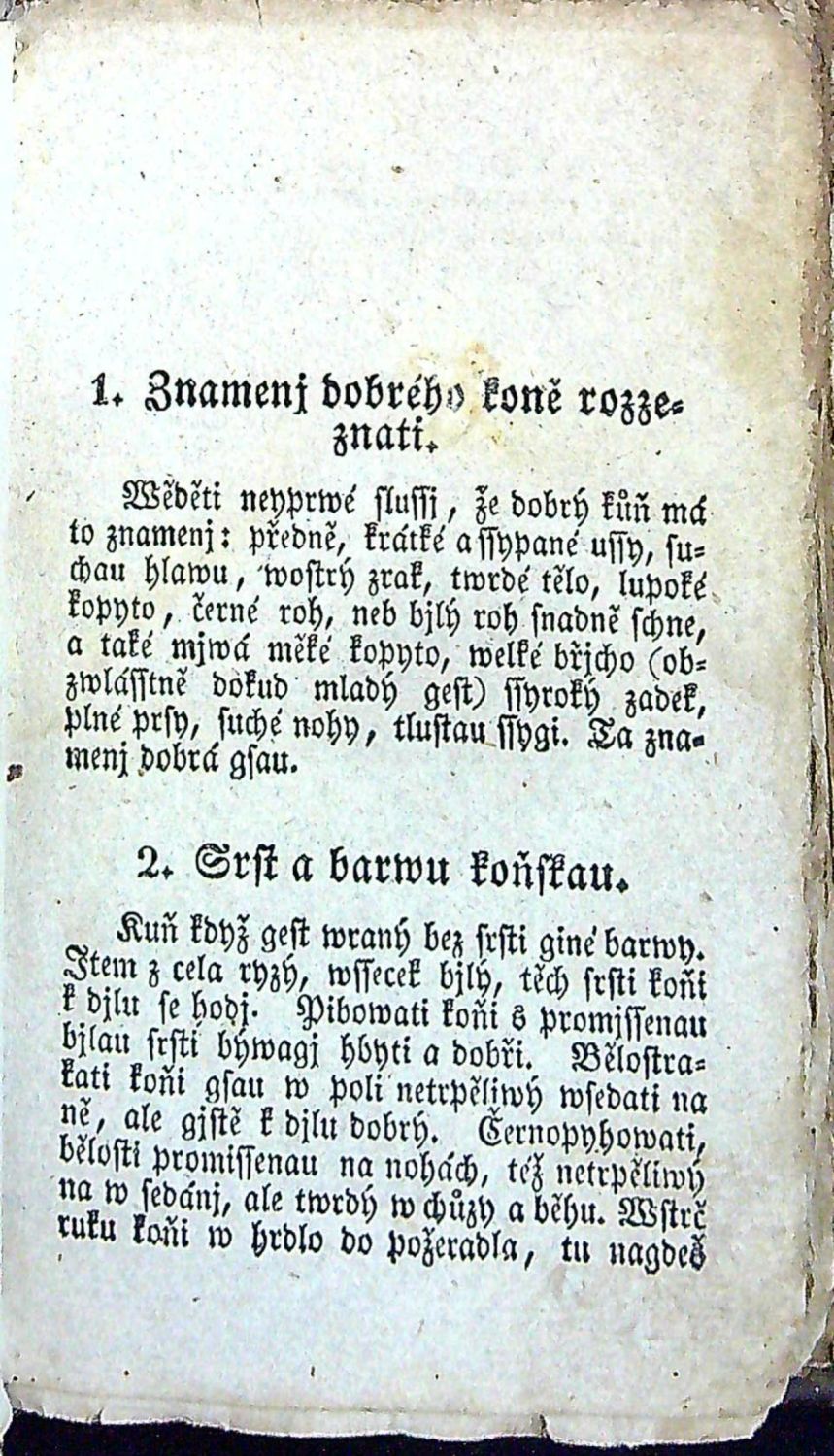 SKC toto vydání neeviduje.<br>Tištěno švabachem, arabská paginace stran při horním vnějším okraji, mizící linky, mizící ozdobné tyče, arabsky číslované naučení. Knižní blok chybně svázaný. Na začátku je svázána strana 133 s mezititulním listem "Skussená koňská lekařstwji. Sepsaná od M. Albrechta Sstolmistra, kowáře a konjře cýsaře Frydrycha". Dřevořezová viněta (oproti jiným vydáním stranově obrácená). <br>Dochované strany: strana 5-12,33-92,97-104,107-128 (svázány za stranou 142),131-132 (za str. 190),133-180 + 2 str. (utržený roh s paginací), strana 141 svázána za stranou 132. Dobová kožená vazba s tlačeným zrcadlem zdobeným ornamentem, uvnitř rámu tlačený ozdobný kříž. Vazba ohmataná a zašpiněná. - Svazek obsahuje řadu, někdy i velmi kuriosních, naučení pro chovatele dobytka, především koňů a krav.