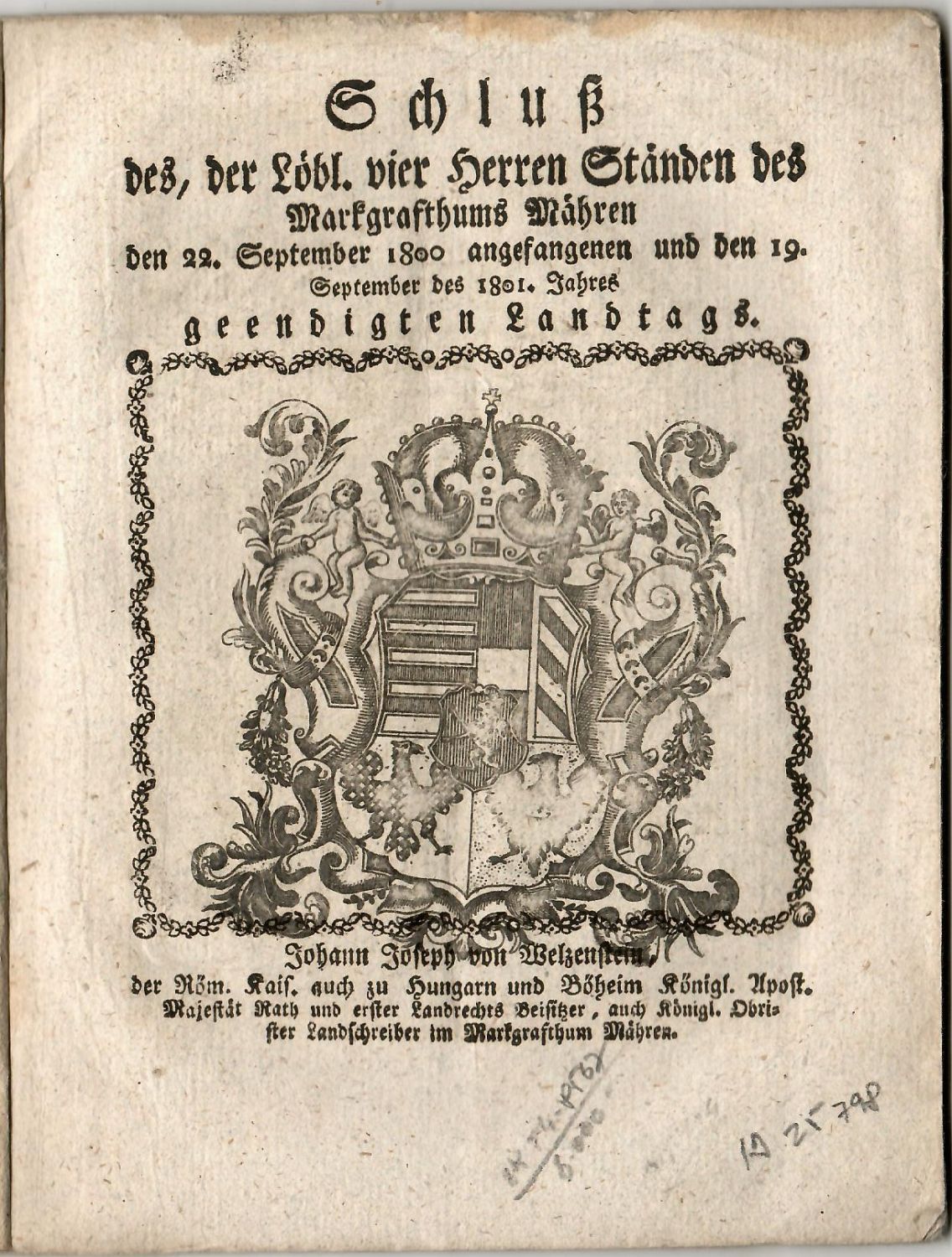 Schluß Des, der Löbl. vier Herren Ständen des Markgrafthums Mähren den 22. September 1800. angefangenen und den 19. September des 1801. Jahres geendigten Landtags.