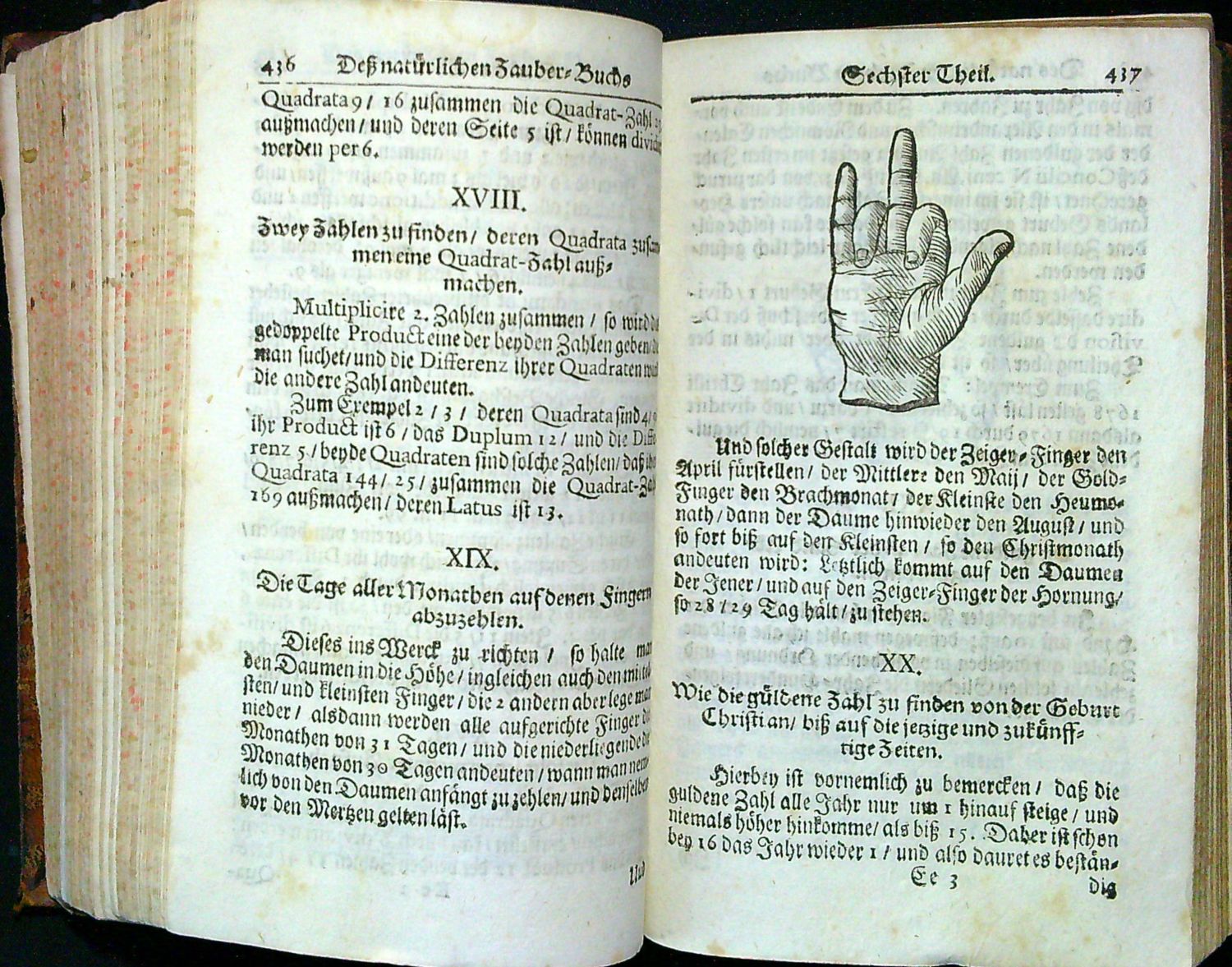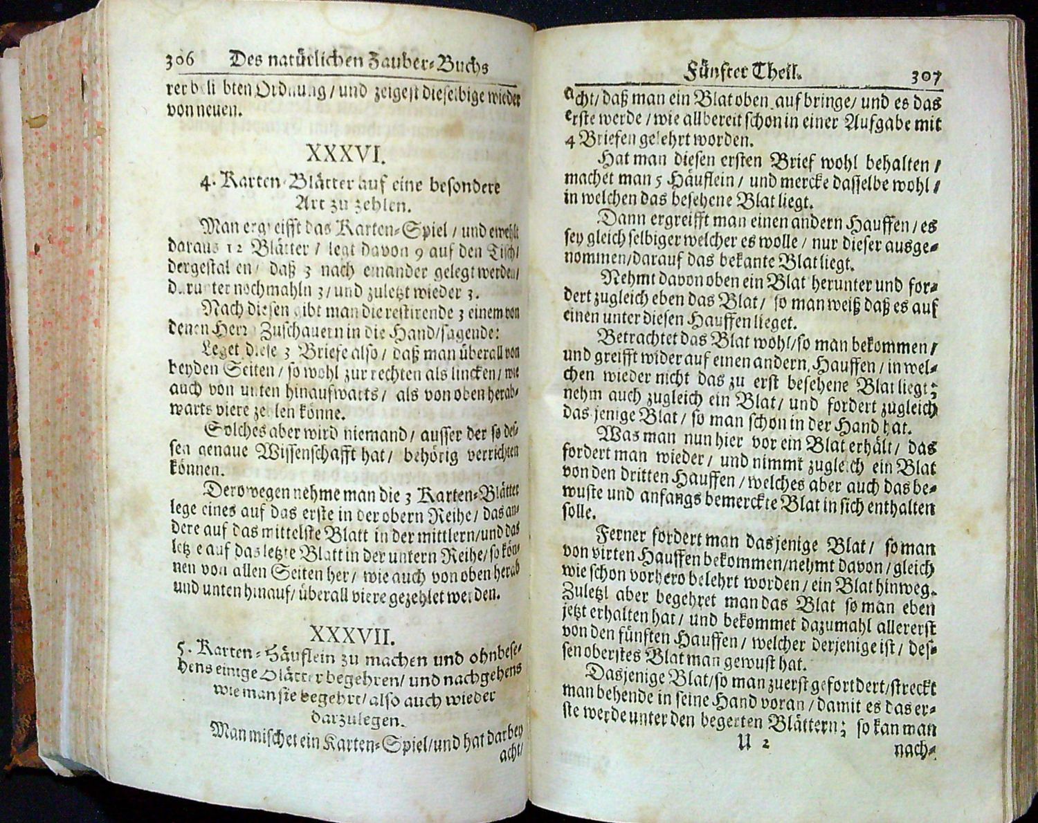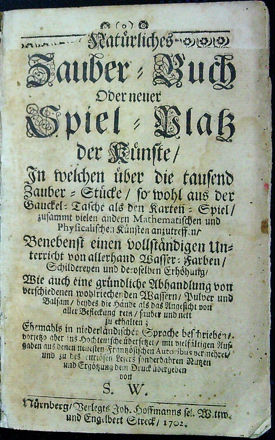 Natürliches Zauber=Buch Oder neuer Spiel=Platz der Künste, In welchen über die tausend Zauber=Stücke, so wohl aus der Gauckel=Tasche als den Karten=Spiel, zusammt vielen andern Mathematischen und Physikalischen Künsten anzutreffen, Benebenst einen vollständigen von verschiedenen wohlriechenden Wassern, Pulver und Balsam, beydes die Hände als das Angesicht von aller Befleckung rein, sauber und nett zu erhalten; Ehemals in niederländischer Sprache beschrieben, vorjetzo aber hochteutsche übersetzet, mu vielfältigen Ausgaben aus denen neusten Französischen Autoribus vermehret, und zu des curiösen Lesers sonderbahren Nutzen und Ergötzung dem Druck übergeben von S. W.