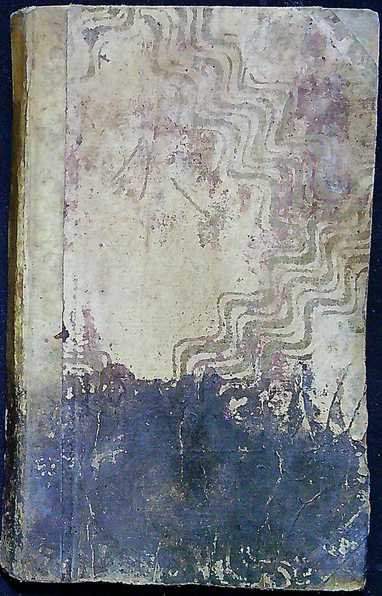 Dobová vazba s dýhovými destičkami potaženými olejovým papírem. Na zadní desce chybí při vnějším okraji v šíři cca 2 cm. Papírový pokryv potrhaný, zašpiněný a na přední dece ve spodní třetině černá mapa. Pergamenový hřbet zašpiněný, titulní list z větší části uvolněný od knižního bloku, od strany 110 při horním vnitřním okraji světle hnědé mapky způsobené vlhkostí, v textu místy tužkou podtrháváno.
