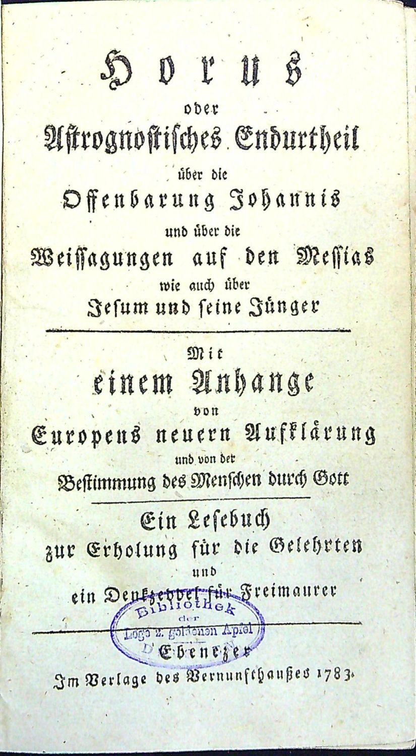 Horus oder Astrognostisches Endurtheil über die Offenbarung Johannis und über die Weissagungen auf den Messias wie auch über Jesum und seine Jünger. Mit einem Anhange von Europens neuern Aufklärung und von der Bestimmung des Menschen durch Gott. Ein Lesebuch zur Erholung für die Gelehrten und ein Denkzeddel (sic!) für Freimaurer.
