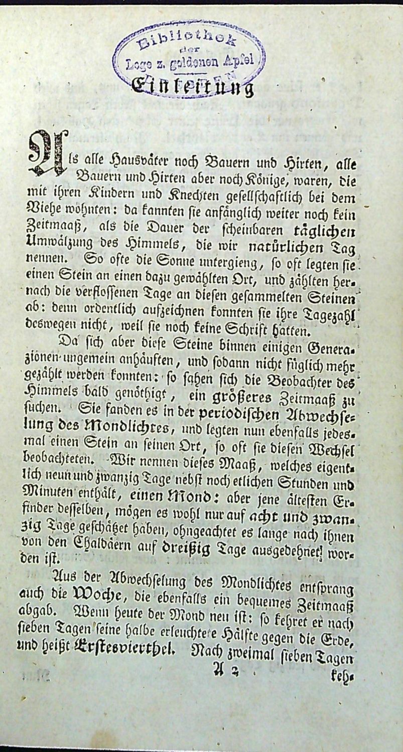 Wolfstieg 4864<br>Tištěno švabachem, latinská slova antikvou, živá záhlaví, tučně tištěné versálky ve výši 2 řádků. Na straně 108, 110 a 112 tři schematické dřevoryty v textu, na straně 51 nebeská znamení v textu.<br>Dobová vazba, kartonové desky potažené mramorovaným papíre, kožený hřbet a nárožnice, ve hřbetu jednotlivá pole dělená ozdobnou zlacenou lištou, ve druhém poli dobový červený kožený štítek s tlačeným a zlaceným názvem, v ostatních polích tlačená a zlacená květina, zeleně barvené ořízky. Kožený pokryv ve hřbetu odřený, v předposledním poli zčásti vydřený a v posledním natržený, naražené rohy. Na přídeštích a předsádkách dobový tragantový papír. Na titulním listu staré razítko zednářské lóže "Bibliothek der Loge z.[um] goldenen Apfel Dresden".<br>Christian Ernst Ernst Wünsch (31.10. 1744 Hohenstein - 28.5. 1828 Frankfurt nad Odrou) matematik a fyzik, od roku 1784 profesor matematiky a fyziky na Braniborské universitě ve Frankfurtu nad Odrou, člen tamější zednářské lóže "Zum Ehrlichen Herzen".