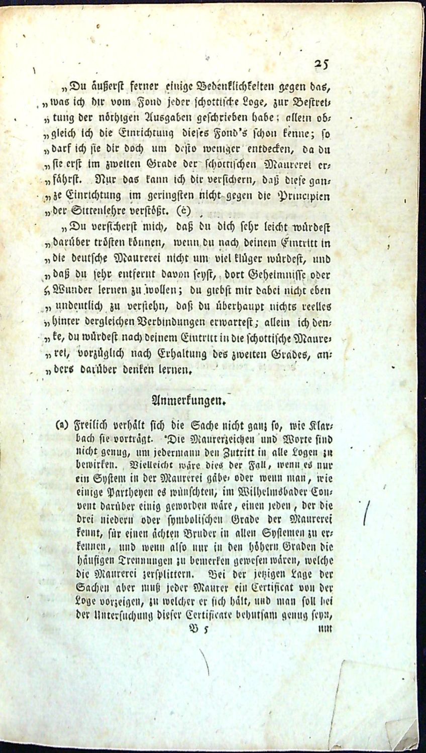 Wolfstieg 43121<br>Tištěno švabachem, tištěné poznámky pod čarou, mizící linky. - Dobová pap. obálka z tragantového papíru, místy vybledlá, ve hřbetu z větší části chybí papírový pokryv, přes hřbet přelepeny dva staré pap. knih. štítky s čísly, přední strana obálky při horním okraji hřbetu natržená, oslí uší, při spodním vnějším okraji stran světle hnědé mapy způsobené vlhkostí. Na tit. listu staré razítko zednářské lóže "Archiv und Bibliothek d. (Loge) Carl zur gekrönten Säule Braunschweig".