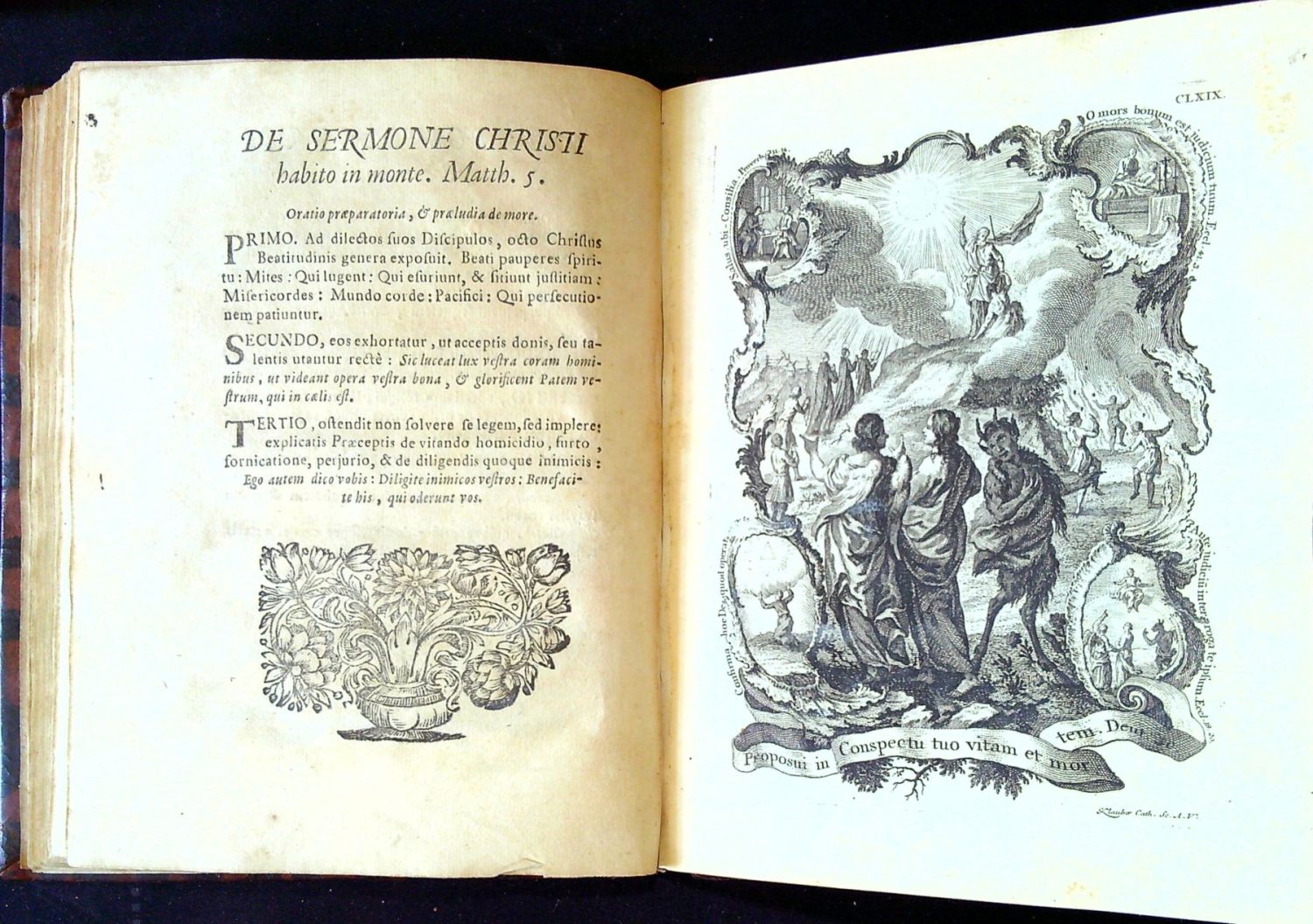 BCBT 10855; Backer-Sommervogel V,65 - námi nabízený exemplář má však odlišného ilustrátora - Klaubera.<br>Titulní list versálkami, impresum oddělené jednoduchou linkou, na tit. str. viněta s emblémem Tovaryšstva Ježíšova, v textu řada dřevořezových vinět bohatého ornamentálního a rostlinného dekoru (květinové, typografické, s holubicemi, s jesuitským emblémem, rozvilinami), konturová iniciála na pozadí rostlinného ornamentu zalomená do výše 7 řádků, tučně tištěné versálky ve výši 2-5 řádků, pásová lišta z rostlinného ornamentu, signatury, nepravidelné kustody. - Ze srovnání s exemplářem s rytinami S. Dvořáka vyplynulo, že text je zcela typologicky, včetně typografické úpravy i výzdoby, shodný. Z neznámých důvodů však již v době vydání knihy někdo nahradil Dvořákovy rytiny, rytinami Klauberovými. Pod Klauberovými rytinami je z velké části stejný rytý text jako pod Dvořákovými. Na foliích A1, Y1, Dd1, Ff1, Gg1, Kk1, Kk2, Mm1, Oo1 a Pp1 jsou Dvořákovy rytiny takřka k nepoznání po celé ploše papíru přelepeny papírem s rytinami Klauberovými, na foliu Hh1 a Ii1 jsou rytiny přelepeny pouze čistým papírem, ostatních 15 rytin je na samostatných z druhé strany nepotištěných listech.<br>Dobová vazba z kartonových desek potažených hnědou hovězinou, ve hřbetu 4 vazy, ve druhém poli světlejší kožený štítek s tlačeným názvem, ve třetím poli zbytek starého pap. knih. štítku, na předním i zadním přídeští a předsádce dobový tragantový papír. Vazba ohmataná a místy mírně odřená, při horním okraji hřbetu lehce natržená, naražené rohy. Na tit. listu perem starý nápis "Bibliotheca" a pak přeškrtaný a nečitelný prov. údaj, na předním vakátu podpis tužkou Jiřího Šalamouna.<br>Bratři Klauberové, Johann Sebastian (cca 1711 - 1768) a Johann Baptist (1712 - po 1787) významní rytci působící v Augspurgu, Johann Sebastian působil i krátce v Praze v dílně Antona Birkharta.
