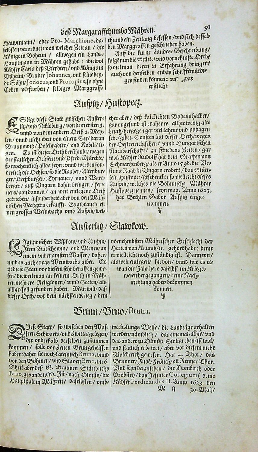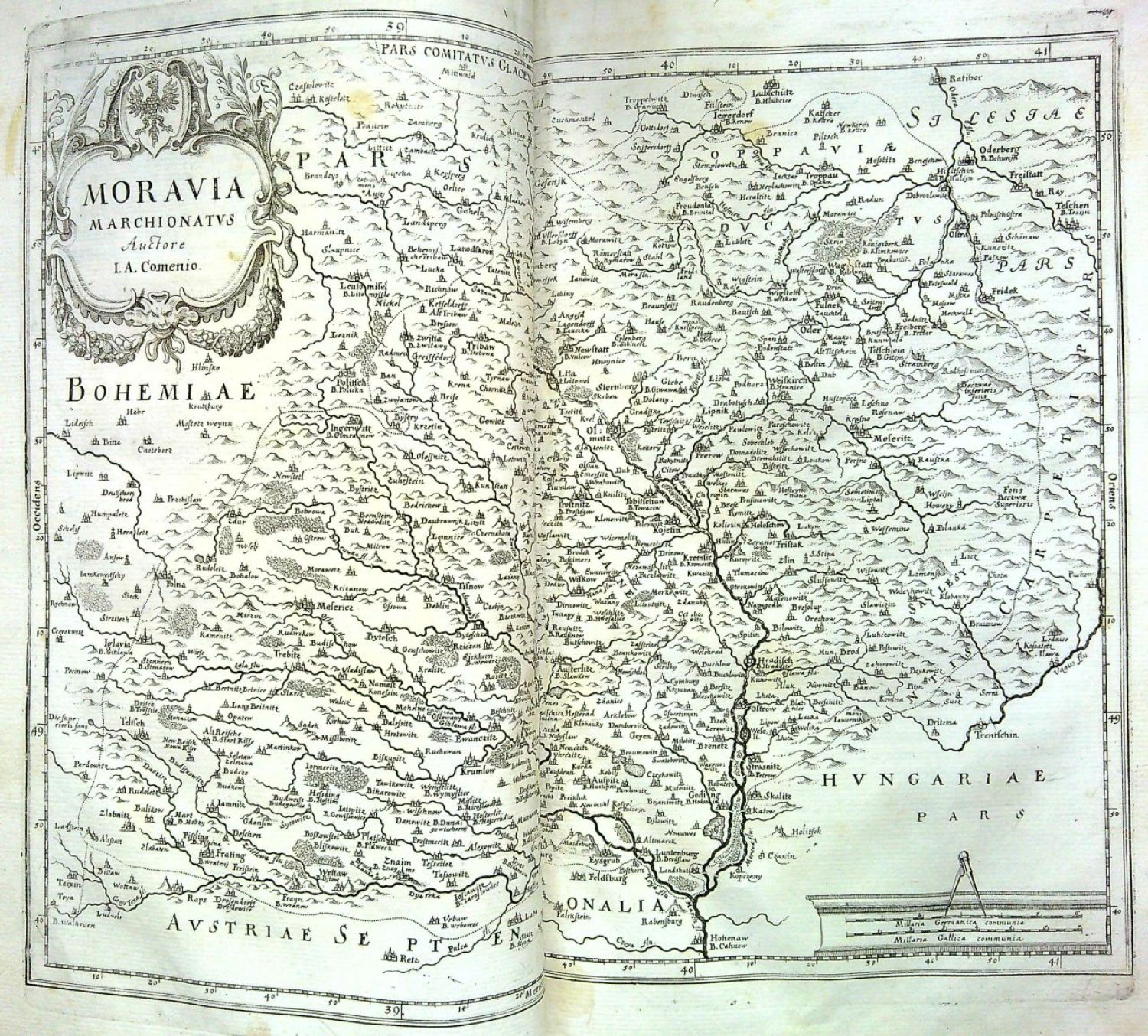 | Ilustrace: | Rytý tit. list s Českými lvy a zemskými znaky v kartuších na horní a dolní straně portálové architektury, vlysy, plné iniciály na ornamentálním pozadí, koncová dřevořez. viněta, 3 dvoulistové mědirytové mapy: za str. 8 anonymní Čechy, za s. 86 Komenského mapa Moravy a za s. [116] mapa Slezska od Martina Helwiga + 32 (z 34) dvoulistových a nesignovaných vedut a plánů měst: Brandejs (Carlo Cappi del.), Karlovy Vary, Chlumec n. Cidlinou (Cappi del.), Kolín (Cappi del.), Chomutov, Čáslav, Cheb, Kladsko, Hradec Králové (se čtyřmi miniaturami, Cappi del.), Louny, Litoměřice (se čtyřmi miniaturami), Plzeň, Polná, plán Prahy, rozkl. veduta Prahy, Ostrov, Slaný, Tábor, Brno, Jihlava, Nové Město na Moravě, Olomouc, Znojmo, Vratislav (plán s přehnutým okrajem dvoulistu), Vratislav(rozkládací veduta), Hlohov, Lehnice a Nisa (2 podélné veduty na dvoulistu), plán Opole, plán Svídnice, veduta Svídnice a Těšín. |