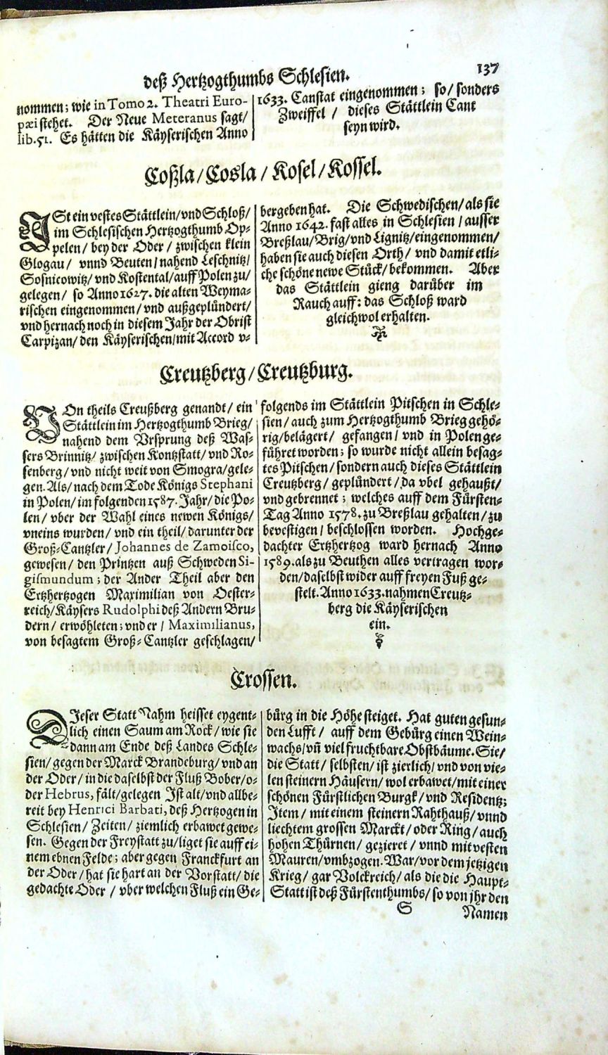 Basilejský a později frankfurtský editor Matouš Merian (1593-1650) vybudoval prosperující nakladatelský dům, který zanikl až roku 1727. V letech 1642-1688 vydával on i jeho následovníci rozměrné jednadvaceti svazkové dílo "Theatrum Europaeum", jehož součástí se stal též svazek věnovaný Čechám, Moravě a Slezsku. Krátký historický text ke každé lokalitě napsal Martin Zeiller (1589-1661), vychovatel v německých šlechtických rodinách.