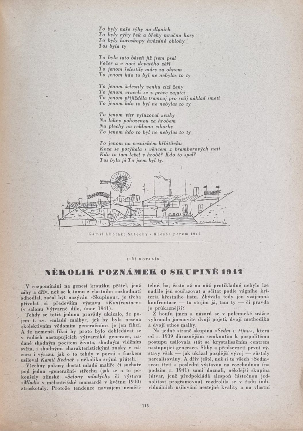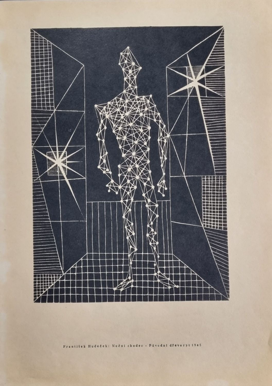 Před stranou 109 původní graf. příloha - František Hudeček "Noční chodec" (207 x 148 mm), dřevoryt. Číslo je věnováno "Skupině 42". - Pův. pap. obálka při spodním okraji hřbetu natržená a na přední straně při spodním vnějším okraji chybí kousek papíru.