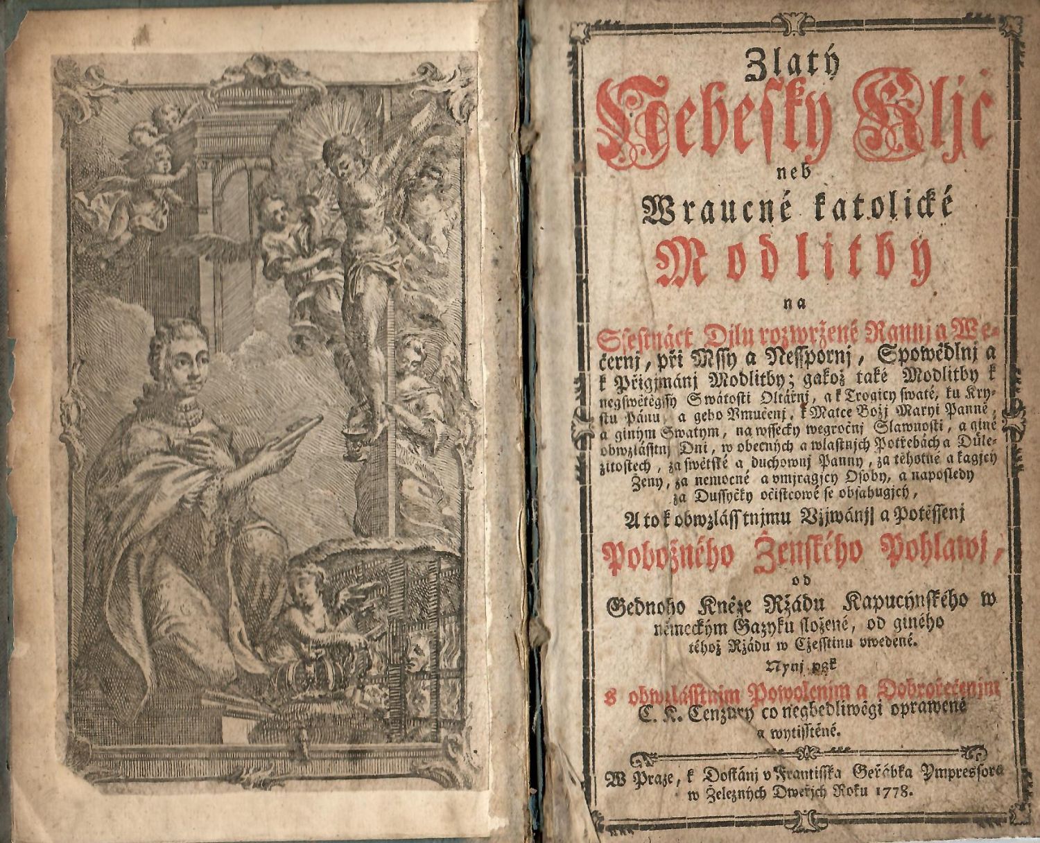 Zlatý Nebeský Kljč neb Wraucné katolické Modlitby na Ssestnáct Djlu rozwržené Rannj a Wečernj, při Mssy a Nesspornj, Spowědlnj a k Přigjmánj Modlitby; gakož také Modlitby k neyswětěgssý Swátosti Oltářnj, a k Trogicy swaté, ku Krystu Pánu, a geho Vmučenj. k Matce Božj Maryi Panně, a giným Swatým, na wssecky wegročnj Slawnosti, a giné obwzlásstnj Dni, w obecných a wlastnjch Potřebách a Důležitostech, za swětské a duchwnj Panny, za těhotné a kagjcý Ženy; za nemocné a vmjragjcý Osoby, a naposledy za Dussyčky očistcowé se obsahugjcý. A to k obwzlásstnjmu Vžiwánj/ a P/otěssenj Pobožného Ženského Pohlawj, od .....