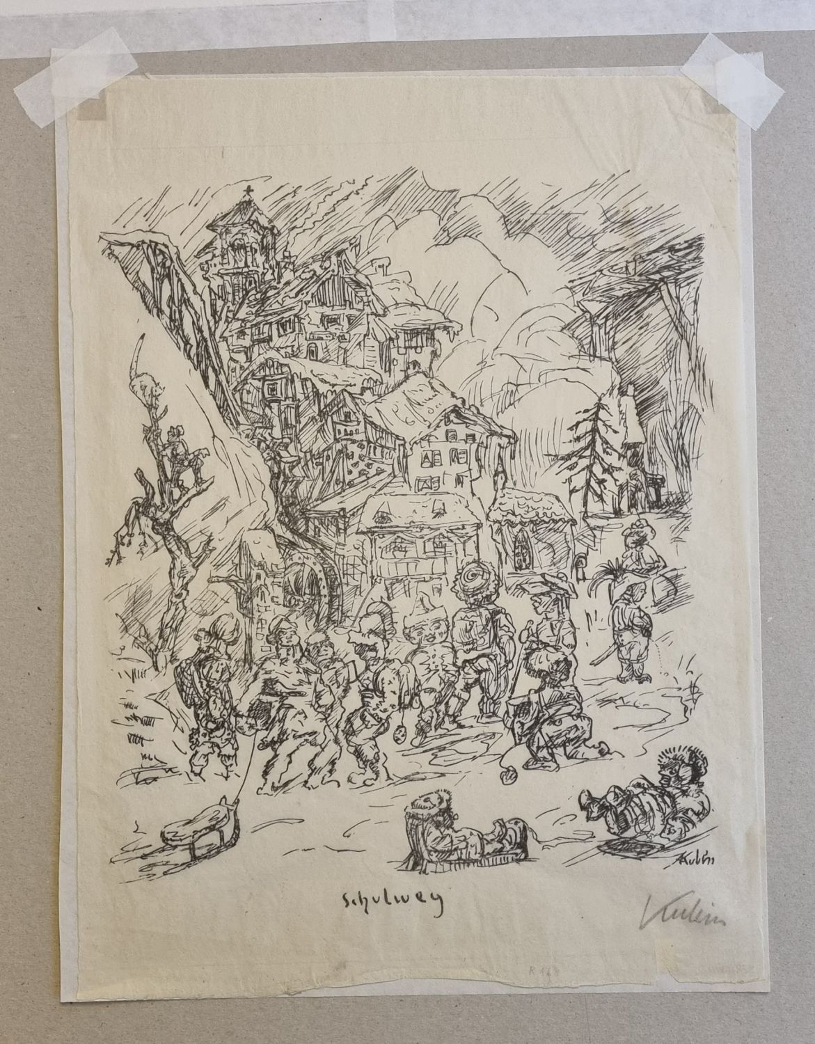 | Litografie, jeden z 35 tisků tištěných na japanu (krom toho bylo tištěno 60 ex. na obyčejném papíře). Název a signatura při spodním okraji desky, vpravo dole tužkou podpis autorův. - List č. 8 z V. mapy grafických listů Kubínových "Traumland I und II" vydané v Berlíně u Fritze Gurlitta roku 1922. (Alfred Kubin "Das litographische Werk" str. 279). List v horních rozích pap. páskou přichycen do pasparty, papír při spodním okraji uprostřed mírně přeložený, pod autorovým podpisem kousek papíru podlepený (bez zásahu do tisku). |