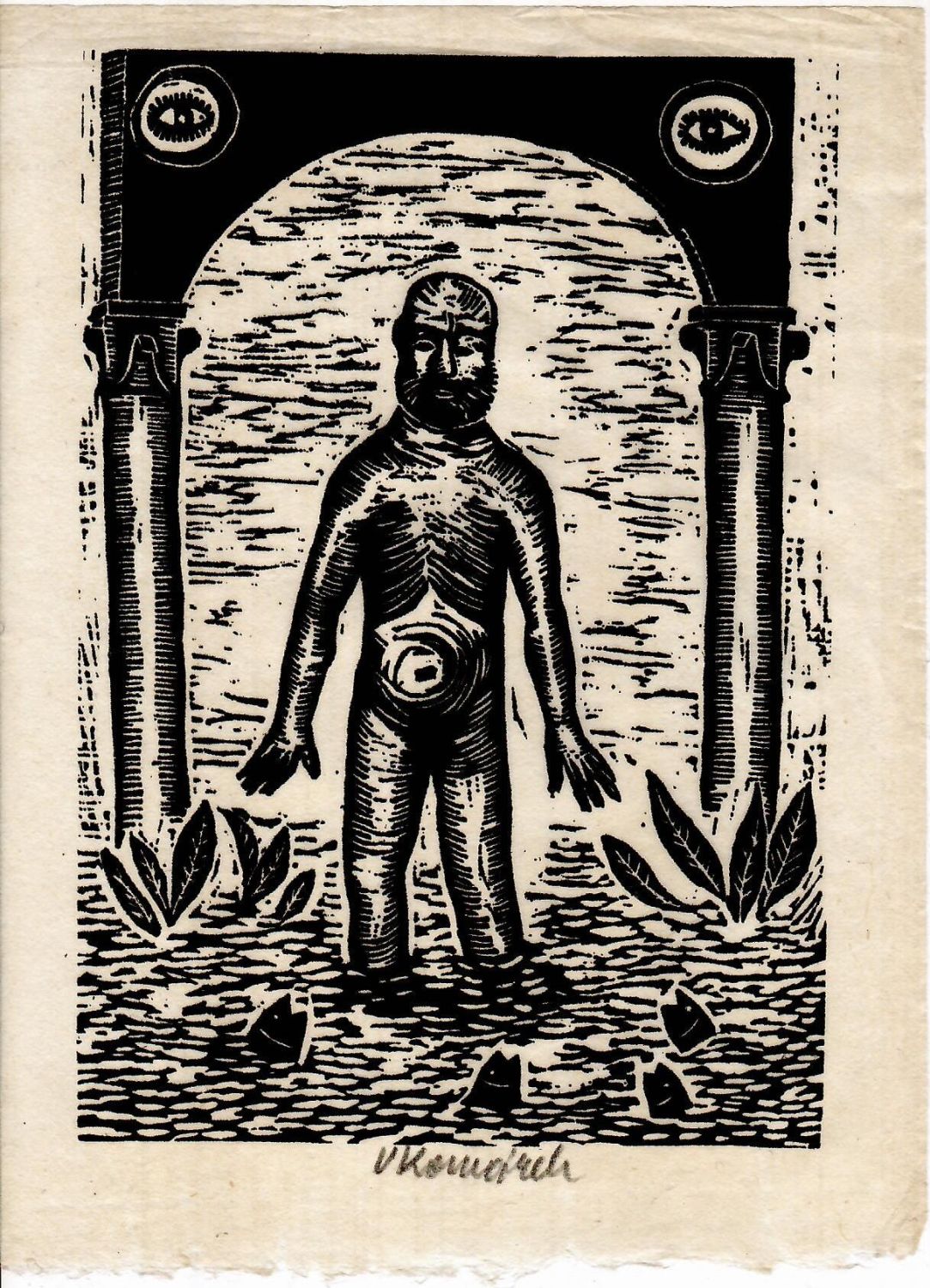 | Linoryt o rozměru tisku 181 x 124 mm na hedvábném papíře o rozměru 210 x 155 mm. Při spodním okraji tisku tužkou autorem signovaný. Spodní část listu neoříznuta. Pravý okraj listu se stopou po zmáčknutí. |
