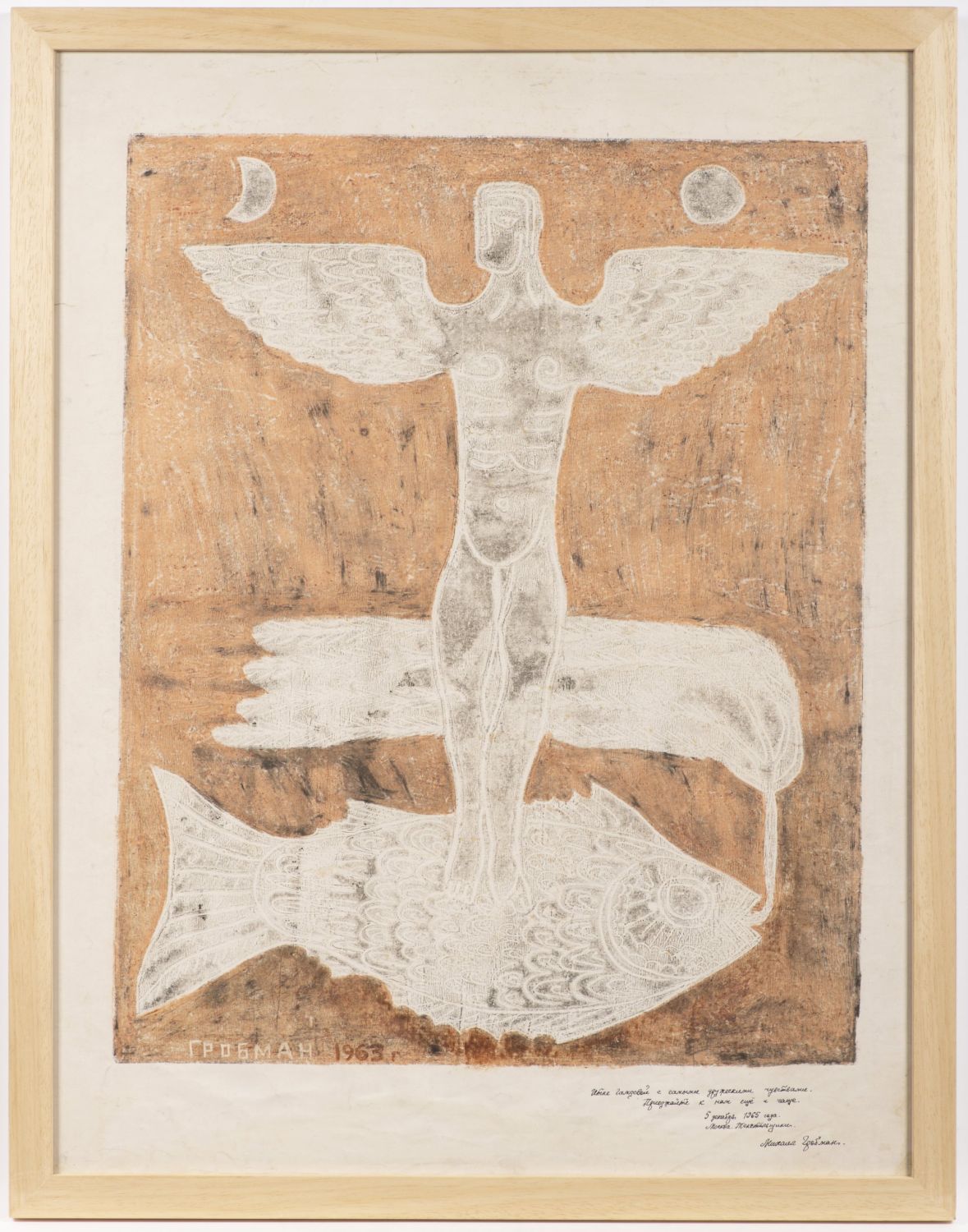 | Původní monotyp, autorem vlevo dole v desce signovaný a datovaný. Vpravo dole pod deskou autorova rukopisná dedikace perem Věře Hamzové v ruštině datovaná 5. prosince 1965 v Moskvě. Zarámováno ve světle hnědém přírodním rámu o rozměru 690 x 538 mm bez pasparty.<br> Věra Hamzová byla v šedesátých letech redaktorkou Výtvarné práce a přítelkyně Václava Bartovského a Jindřicha Chalupeckého, se kterým byla v roce 1965 v Moskvě, a se kterým navštívila řadu ateliérů neoficiálních ruských umělců. |