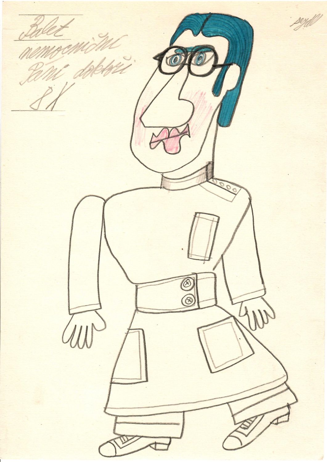 | Kresba tužkou, kolorováno modrou a růžovou fixou. Volný list o rozměru 296 x 209 mm. V pravém horním rohu autorem tužkou signováno. |