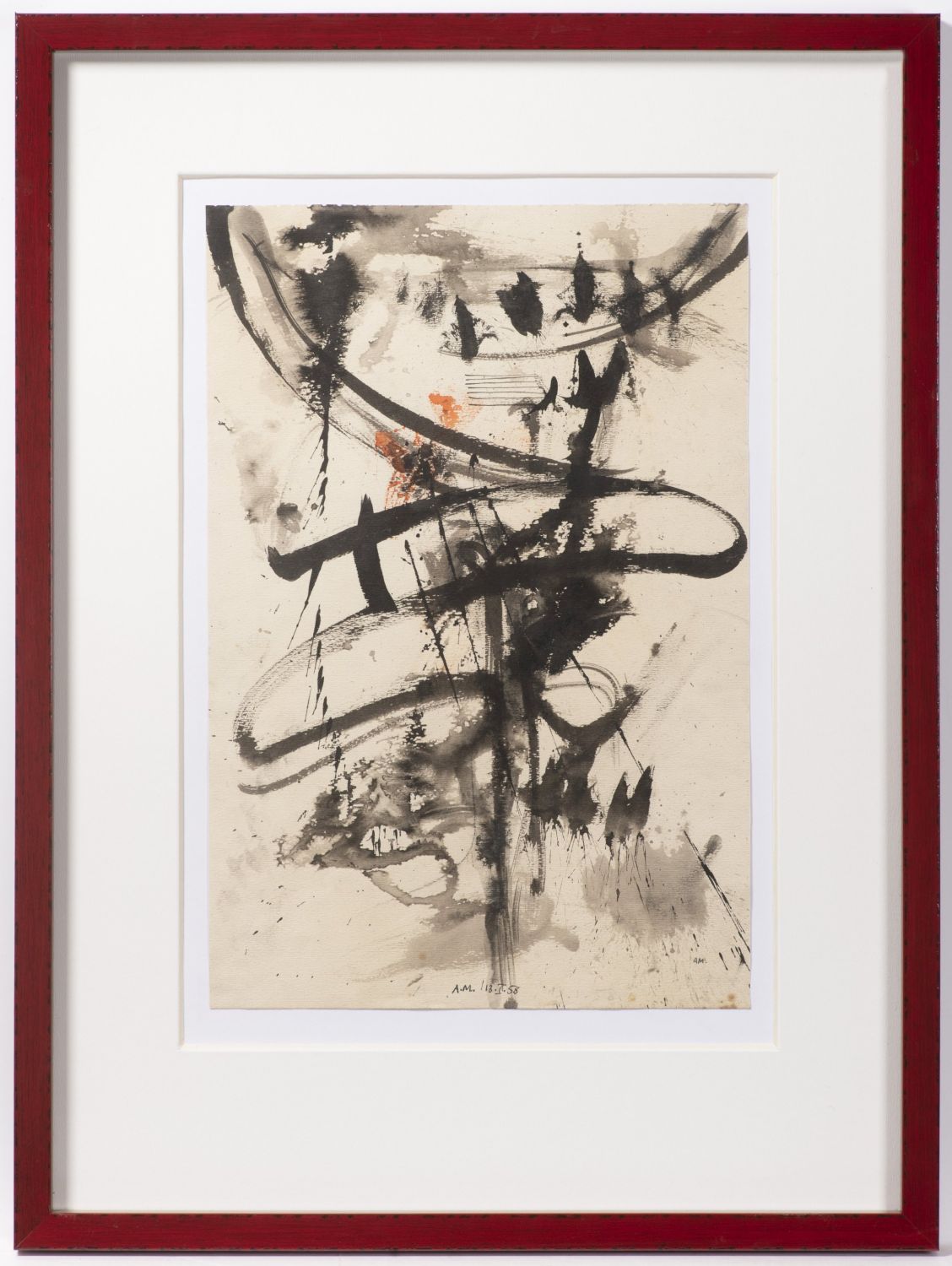 | Lavírovaná kresba tuší a akvarelem, uprostřed spodního okraje autorem monogramem podepsaná a datovaná "13.I.58", při pravém spodním okraji též autorův monogram. Zarámováno v jednoduchém temně červeném rámu o rozměru 630 x 470 mm. List je olemovaný hlubokou paspartou. Provenience: zakoupeno přímo od autora. |