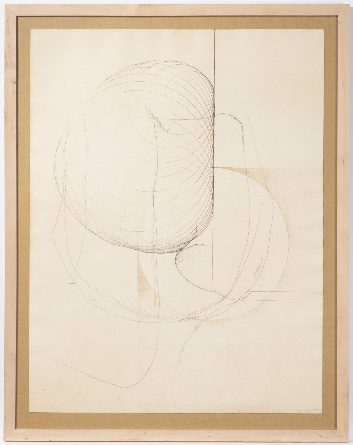 | Malba tuší a rudkou, vpravo dole tužkou autorem monogramem signovaná a datovaná "8.2.69". Zarámováno ve světlém přírodním rámu o rozměru 735 x 585 mm. Provenience: práce byla zakoupena od Jana Koblasy, který spravoval Valentovu pozůstalost. |
