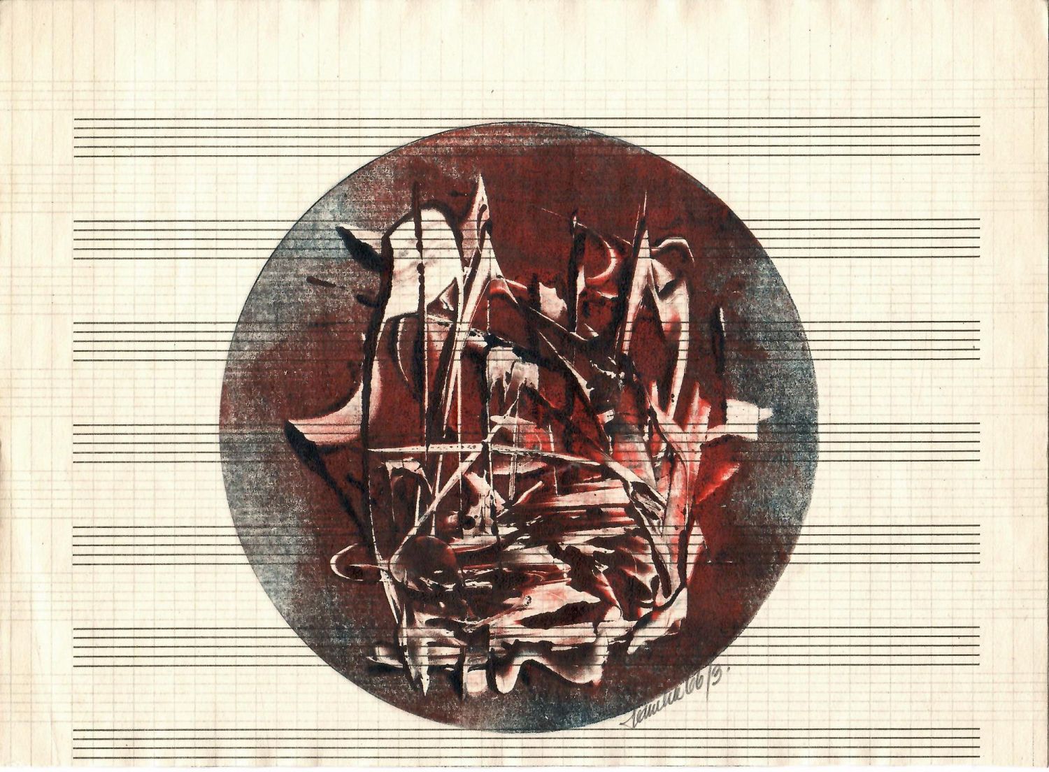 | Monotyp o průměru tisku 145 mm na notovém papíru o rozměru 188 x 250 mm. Volný list. Autorem při pravém spodním okraji tisku tužkou signováno a datováno. |