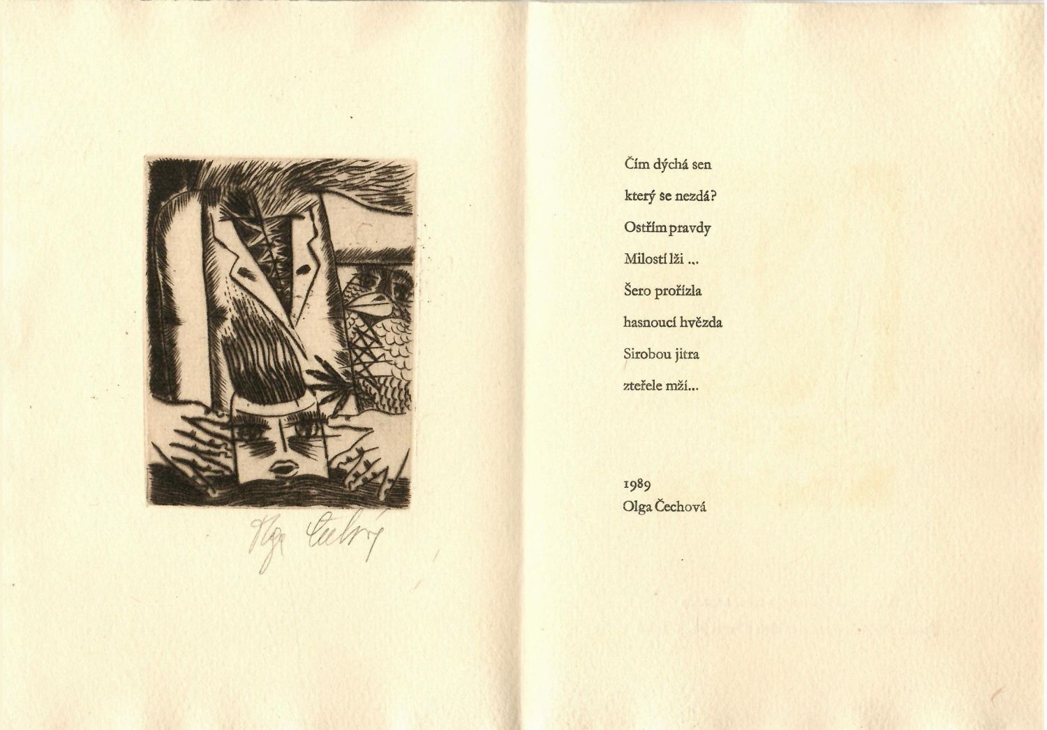 | Suchá jehla, autorkou při spodním okraji tisku tužkou podepsaná. Grafika na složeném listu s básní. Věnováno účastníkům valné hromady Spolku sběratelů a přátel exlibris v Praze 31. 3. 1990. Složený list. |
