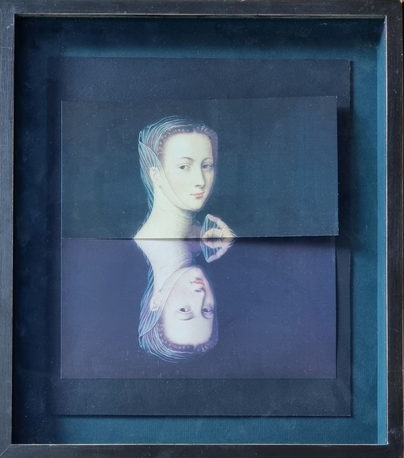 | Koláž autorem adjustovaná na černý kartonový papír, vpravo pod koláží autorův podpis tmavou propis. tužkou a datace, na rubu ve výřezu autorův podpis a datace modrou propis. tužkou. Práce adjustována ve vysokém tmavém rámu, vlevo dole na rubu rámu pap. štítek s uvedením názvu a prodejní cenou 40.000,-Kč. |