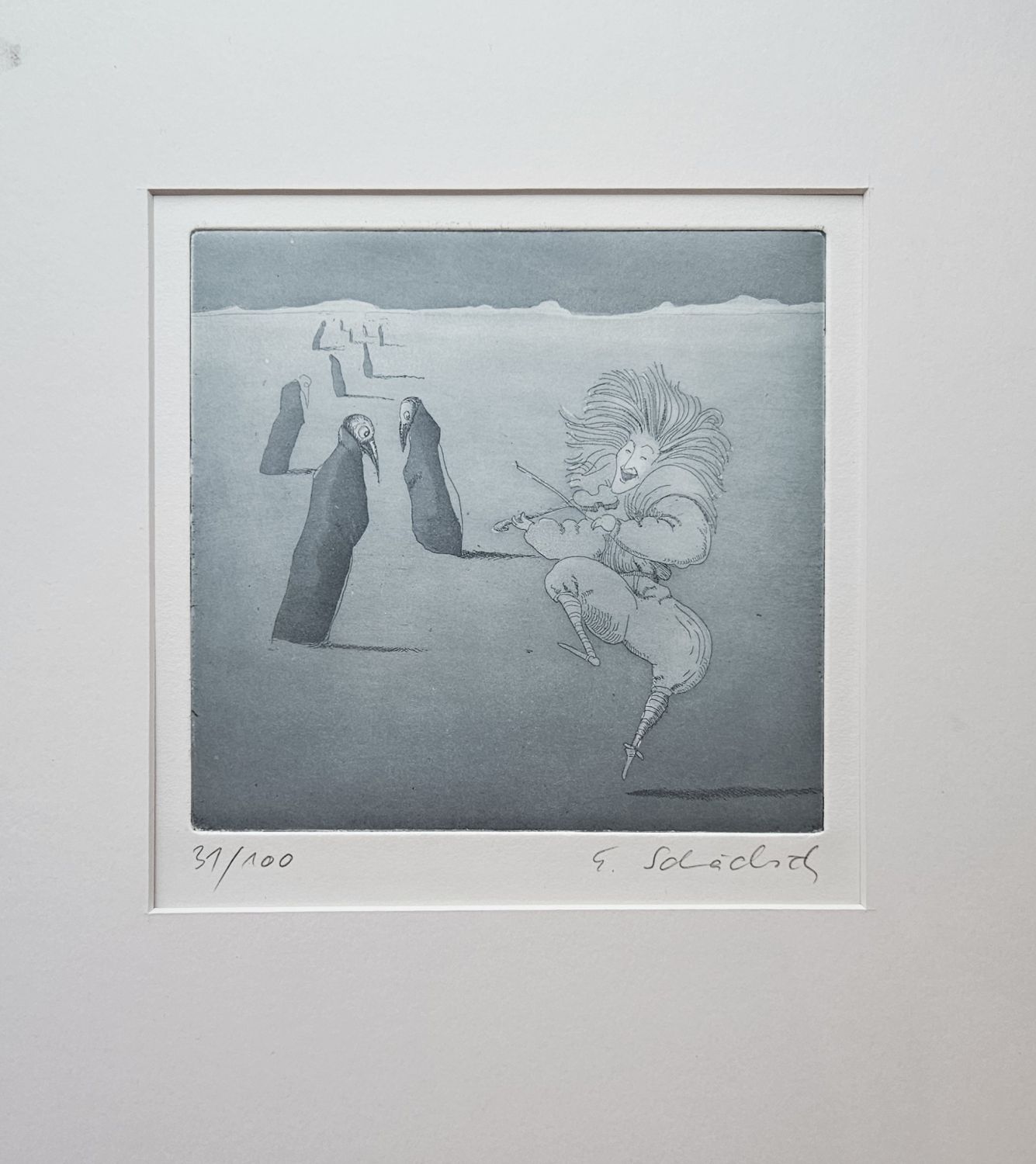 | Akvatinta autorem vpravo dole pod deskou tužkou podepsaná, vlevo dole číslo tisku 31/100. Volný list při horních okrajích zachycený v karton. paspartě. |