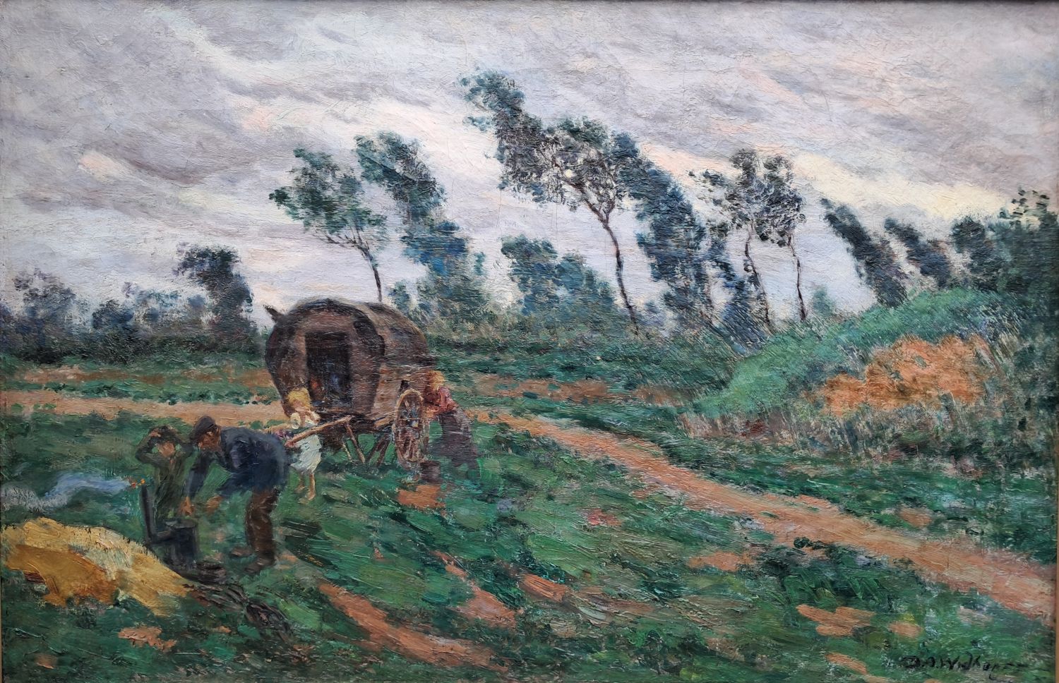| Olej na plátně, autorem podepsaný vpravo dole. Práce je opatřena světlým dřevěným rámem. |
