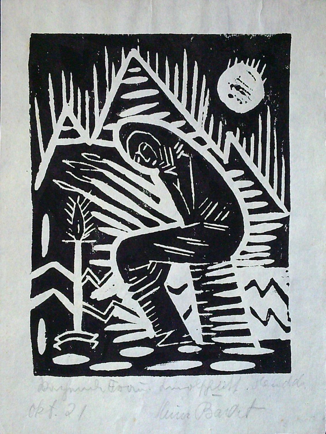 | Linoryt o rozměru 158 x 120 mm z roku 1921. Volný list (200 x 150 mm), na spodním okraji autorem tužkou uvedený název, technika, datum "Okt. 21" a signatura. |