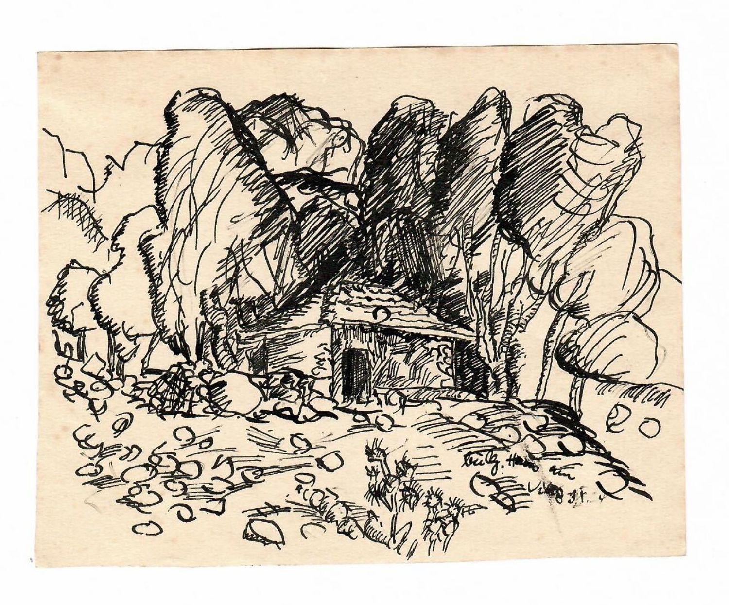 | Kresba tuší na volném listu o rozměru 117 x 147 mm. V pravém spodním rohu autorem tuší signována. List je v obou horních rozích přichycen k podkladovému papíru. |