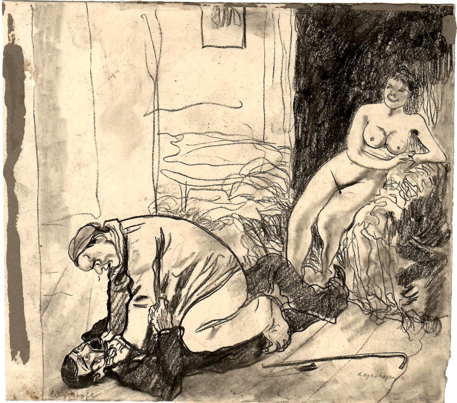 | Kresba uhlem, volný list o rozměru 168 x 190 mm. Při levém a horním okraji přilepeny zbytky tmavého papíru (patrně stopy po předchozí adjustaci). Kresba tužkou signována v levém i pravém spodním rohu. |