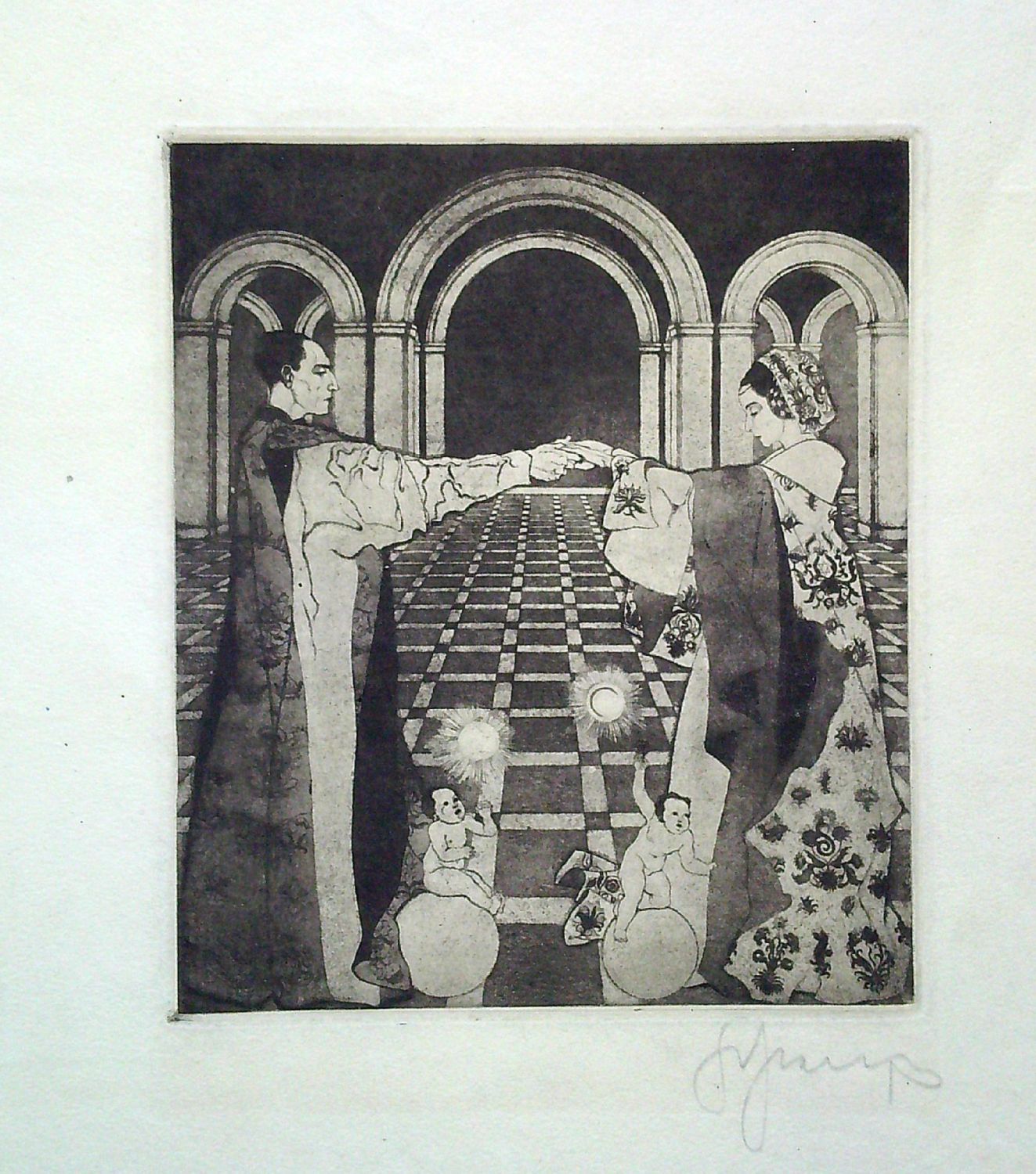 | Akvatinta vpravo dole pod deskou autorem tužkou podepsaná, volný list při horních okrajích papíru pap. štítkem přichycen k paspartě. Sepp Frank (28.8. 1889 Miesbach - 20.2. 1970 München), německý grafik, ilustrátor a malíř. Vystudoval Akademii výtvarných umění v Mnichově. Vitrážemi vyzdobil několik kostelů a katedrál (Mnichov, Limburg, Bamberk). |