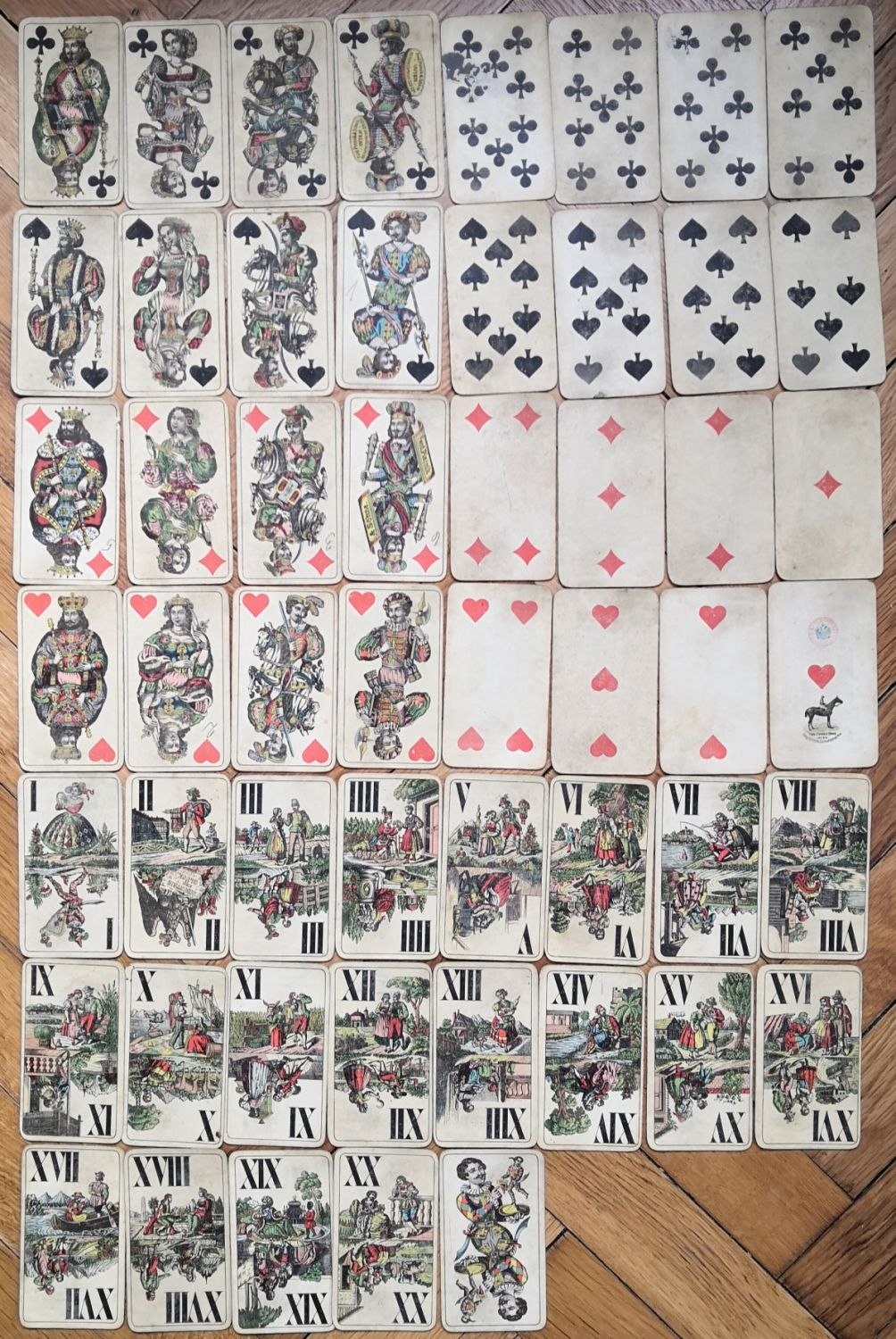 | 53 z 54 listů tarokové sady středoevropského typu pro čtyři hráče: čtyři barvy (kříže, piky, káry a srdce) po osmi listech, taroky č. I-XX (č. XXI chybí) a škýz. Název firmy nese kárový a křížový kluk a srdcové eso, na posledním též "k. k. Kartenstempel". - Listy ohmatané, křížová osma a desítka na líci odřené, celkově však dobrý stav. - Ferdinand Piatnik (1819-1885), narozen v Budě a vyučen v Prešpurku, nastoupil r. 1839 jako tovaryš do malé vídeňské dílny Antona Mosera na výrobu ručně malovaných hracích karet. V roce 1843 firmu převzal pod svým jménem a později se oženil s vdovou po původním majiteli. Od roku 1882, kdy do podniku přistoupili jeho synové Ferdinand, Adolf a Rudolf, nazývala se firma Ferdinand Piatnik & Söhne. Počátkem 90. let přebírá řízení společnosti Rudolf a rukodělná výroba je modernizována na strojní, následuje expanze do Budapešti, r. 1898 je odkoupena pražská firma „Ritter & Cie“, počátkem 20. století vídeňská tiskárna a konkurenční firma, r. 1907 papírna ve Slovinsku a r. 1926 je založena továrna na výrobu karet v Krakově. Přes válečné a poválečné peripetie existuje firma s filiálkami v Americe a později opět v Budapešti, Praze a v Německu dodnes. |