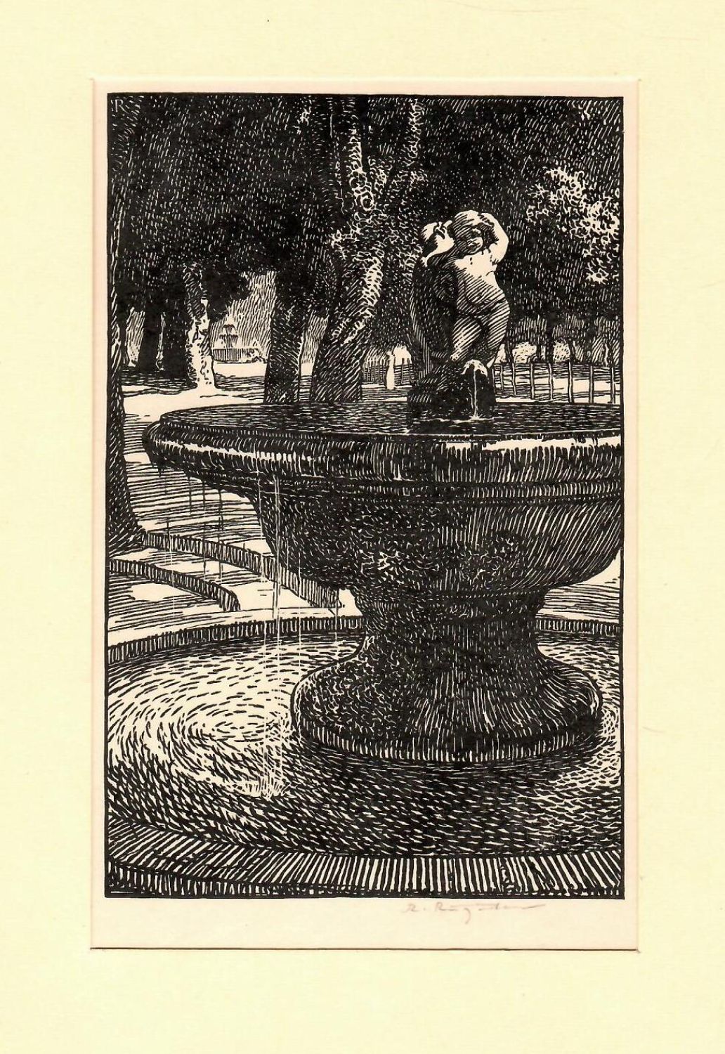 | Dřevořez, autorem signováno v desce a při spodním okraji tisku. Na rubu listu razítko sbírky Waldesova obrazárna s č. 1075 a razítko NGGS. List je v obou horních rozích přichycen k papírové paspartě. |