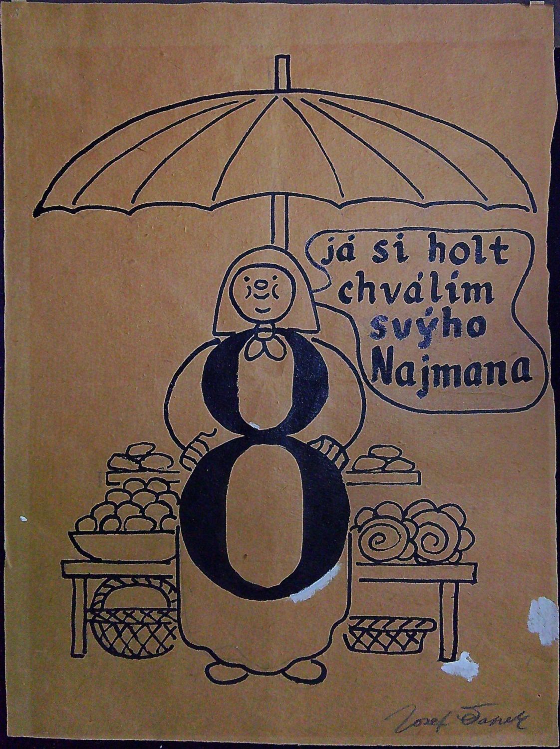 | Kombinovaná technika (tuš, tužka, běloba) na papíře, volný list, autorem podepsaný tužkou vpravo dole. <br>Josef Václav Najman (20. 4. 1882 Skála - 4. 12. 1937 Praha) byl český politik, redaktor a novinář. Ve dvacátých a třicátých letech působil jako poslanec Národního shromáždění ČSR a mimo jiné zastával funkce 9. ministra železnic ČSR a 11. ministra průmyslu, obchodu a živnosti ČSR. |