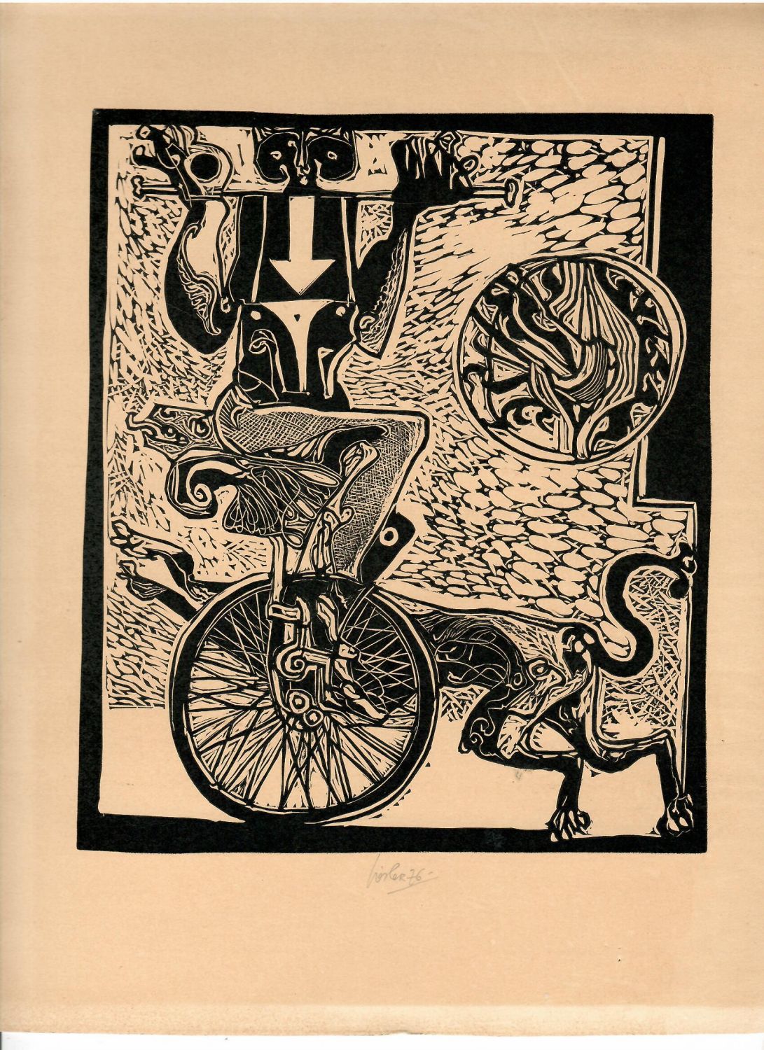 | Linoryt, volný list, uprostřed dole pod deskou autorem podepsaný a datovaný. |