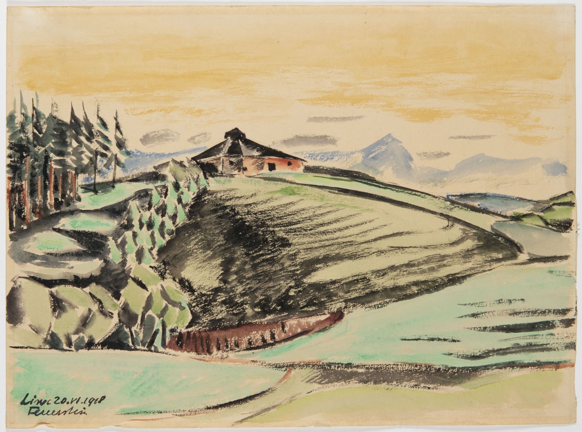 <p>Akvarel na papíře, vlevo dole signovaný a datovaný "20.VI.1918". Práce je opatřena hlubokou paspartou a světlým přírodním rámem z olše. Akvarel pochází z pozůstalosti Bedřicha Feuersteina. - Práce je reprodukována in Helena Čapková "Bedřich Feuerstein architekt", Praha, NTM, 2021, strana 280, obrázek č 26+2..</p>