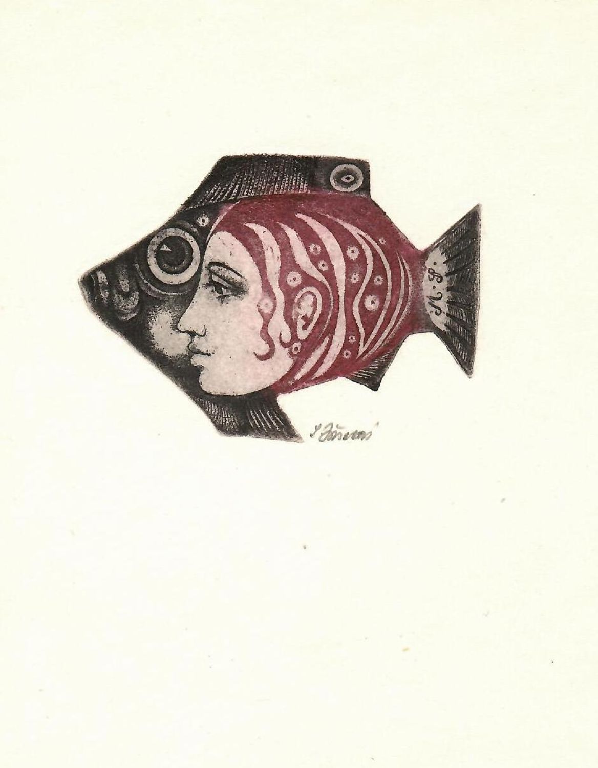 | Barevný lept, volný list, uprostřed dole pod deskou autorkou tužkou podepsaný, v desce v ocasu ryby vyleptaná písmena M. Š. (Soupis č. 898). |