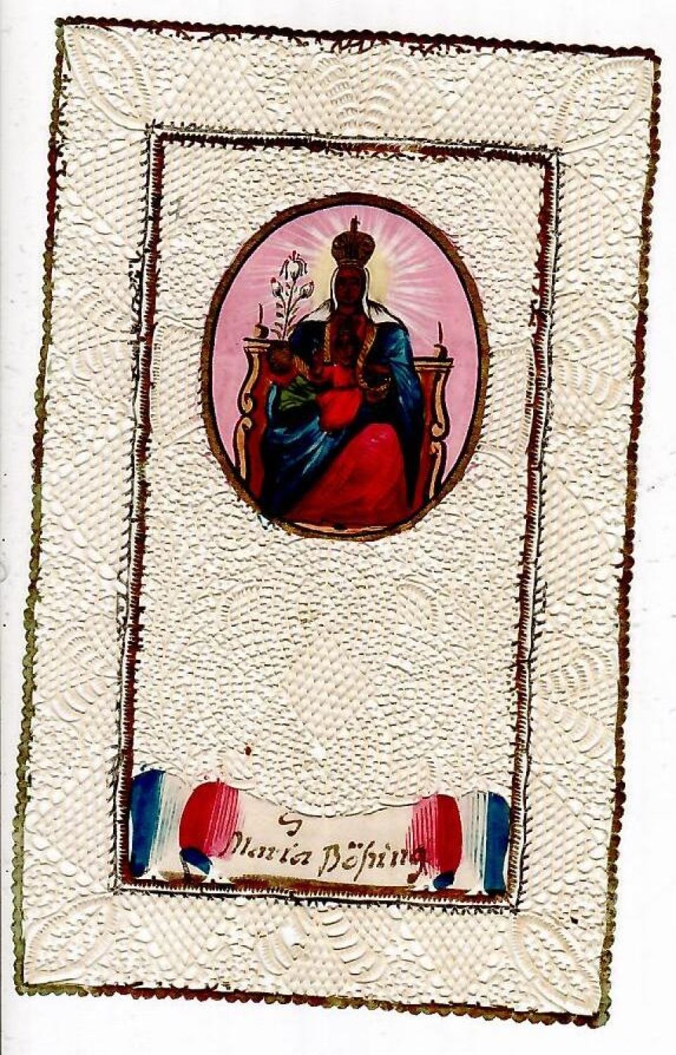 | Canivet na papíře s miniaturou Marie malovanou kvašem. Na rubu jméno autorky miniatury (?) Elennora Ziglheimin (?). Canivet, druh svatého obrázku. Jemně ručně řezané či vypichované motivy imitující krajku obklopují miniaturu malovanou olejem, kvašem či akvarelem. V módě byly tyto obrázky především v 17. a 18. století a byly vyráběny především v ženských klášterech. Od poloviny 19. století řada tiskařských dílen začala canivety imitovat, krajkové ručně řezané či vypichované motivy však byly raženy strojově, proto se již o skutečné canivety nejedná. |