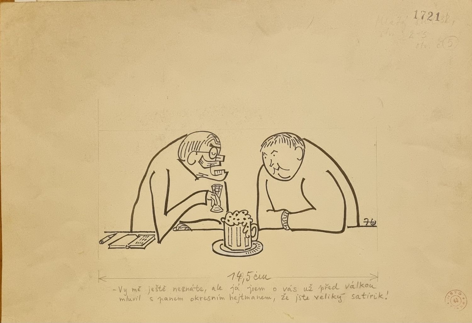 | Kresba tuší, pod kresbou připsán tužkou doprovodný text. V pravém spodním rohu listu kulaté razítko. Papír ohmatán. Kresba je reprodukována v knize "Karikatura bojující" na straně 125. Volný list. |