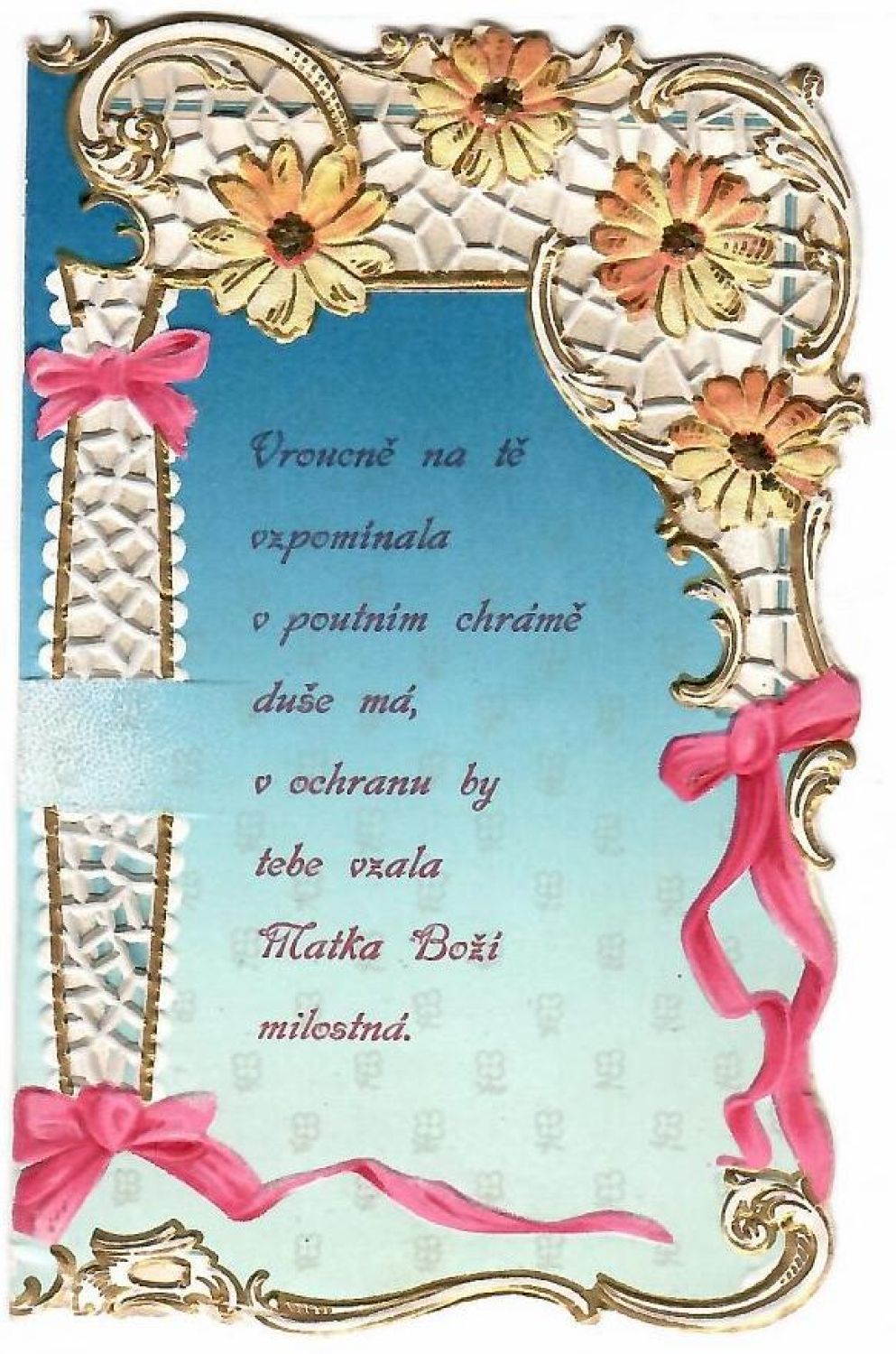 | Přední deska s krajkovým papírem, uvnitř barevná reprodukce Panny Marie, na zadní desce česky psaný text. |