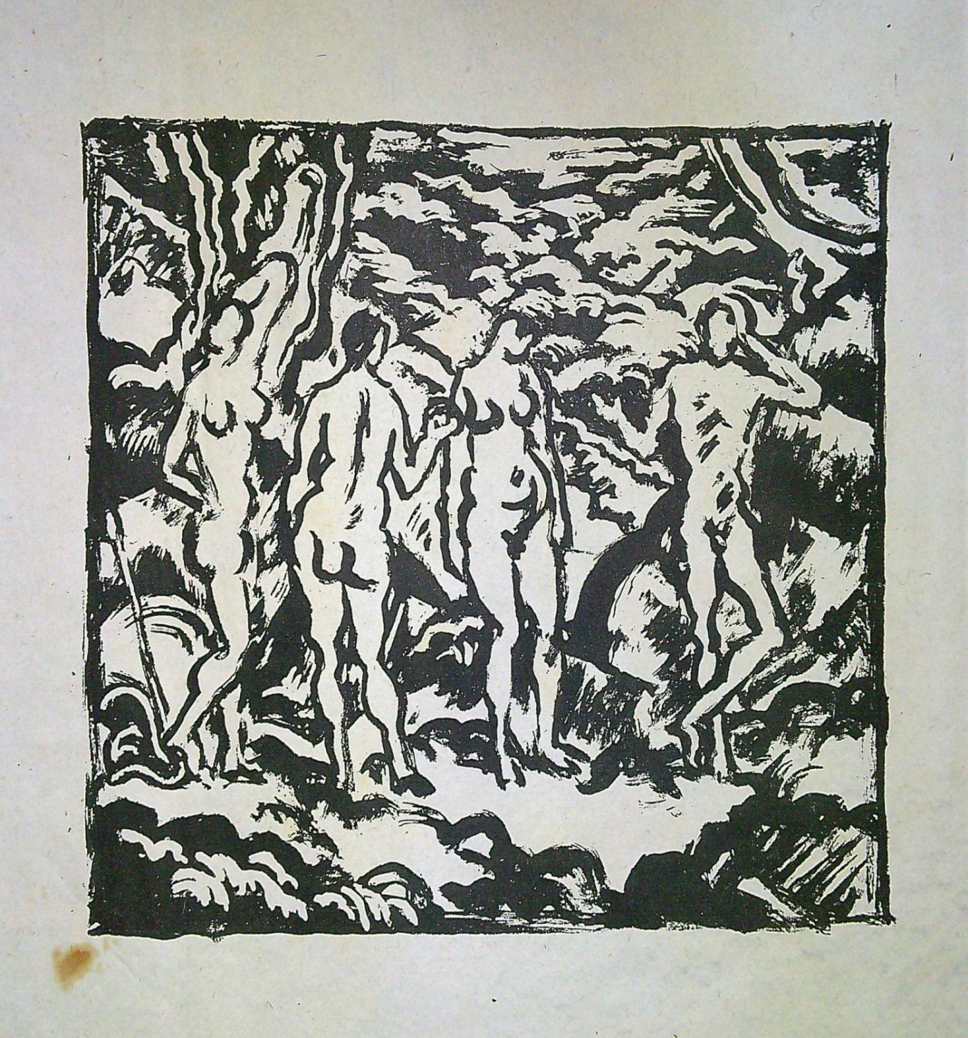 | Štětcová litografie tištěná na jemném rýhovaném papíře. Volný list autorem nepodepsaný. Okraje papíru neoříznuté, papír v pravé části přes celou výši lehce přeložený a při horním okraji lehce pomačkaný (bez zásahu do tisku), vlevo pod deskou hnědá skvrnka (bez přesahu do vlastního tisku). |