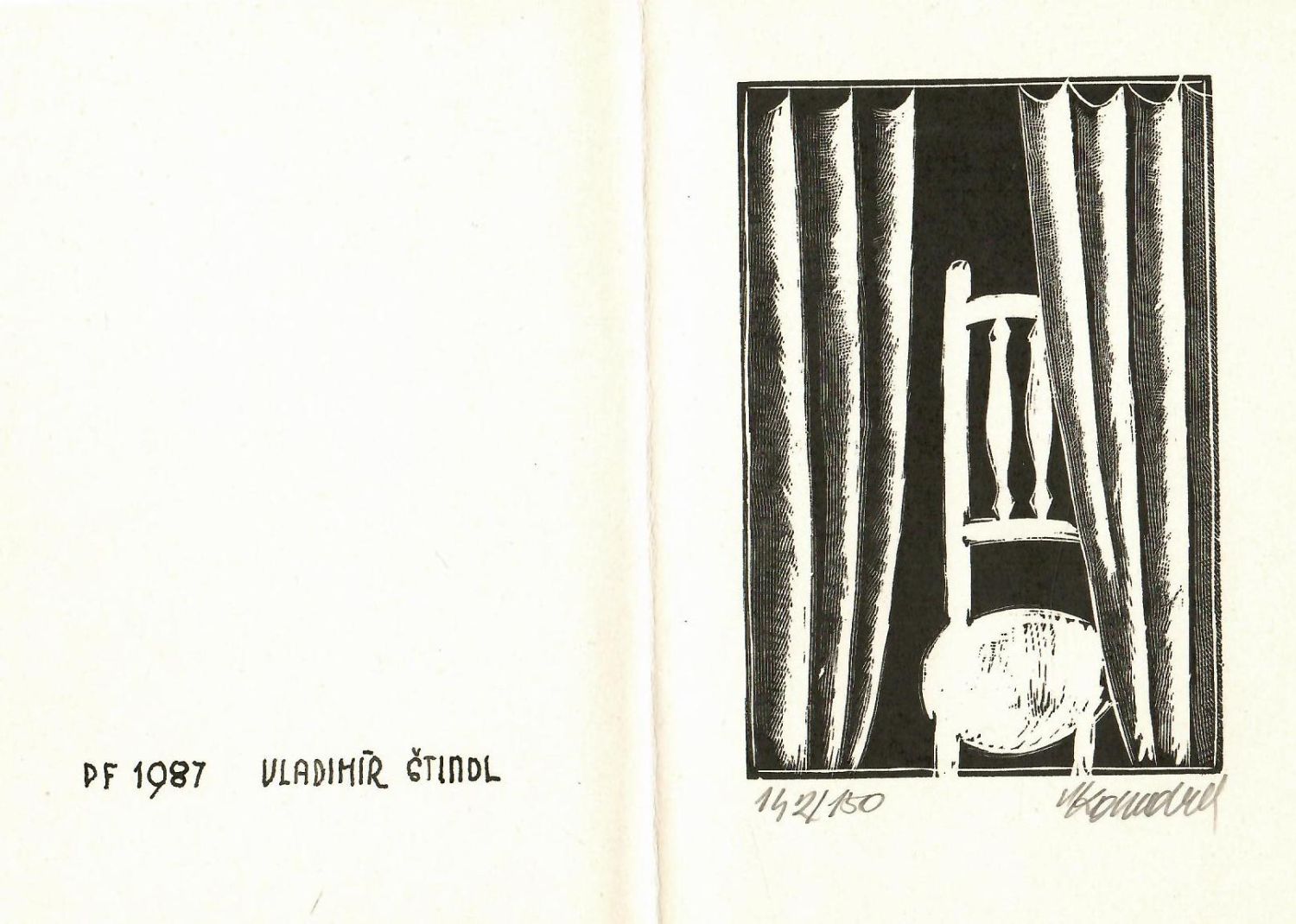 | Dřevoryt, autorem při spodním okraji tisku tužkou signováno a číslováno 142/150. Na protější straně listu černým inkoustem přípis "PF Vladimír Štindl". |