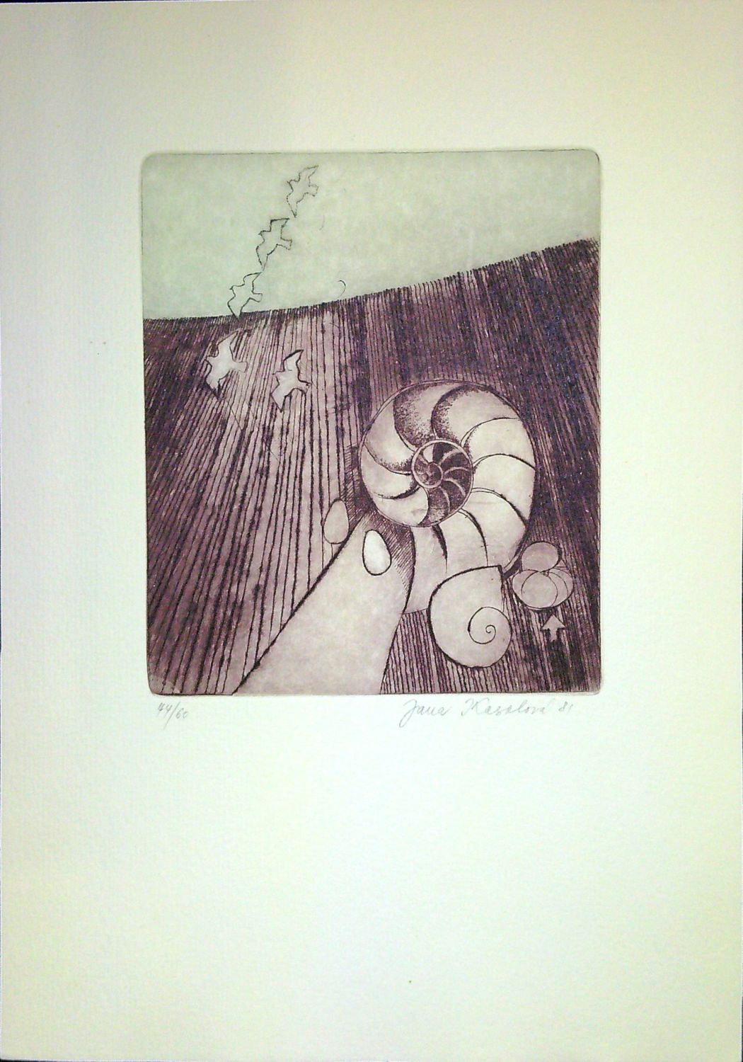 | Suchá jehla o rozměru tisku 153 x 129 mm. Autorkou při spodním okraji tisku tužkou signováno, datováno a číslováno. Č.ex. 44/60. |