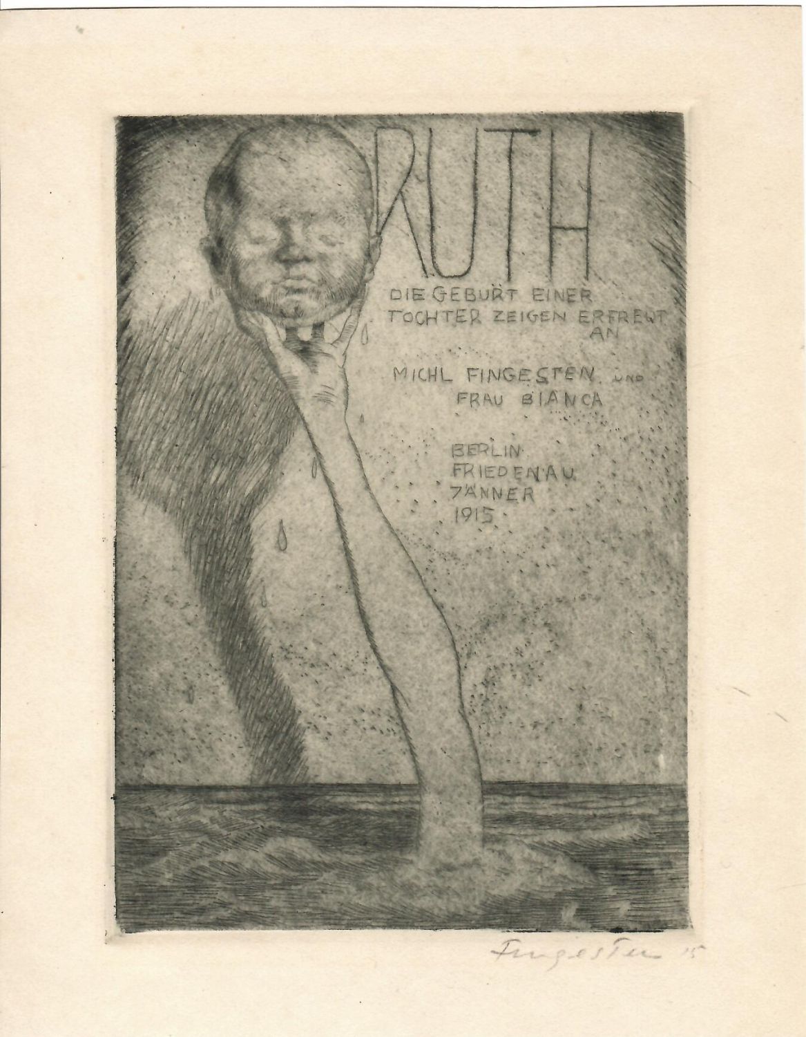 | Lept vpravo dole pod deskou autorem tužkou podepsaný a datovaný. - Práce vznikla u příležitosti narození dcery Ruth manželům Michlovi a Biance Fingestenovým, volný list. |