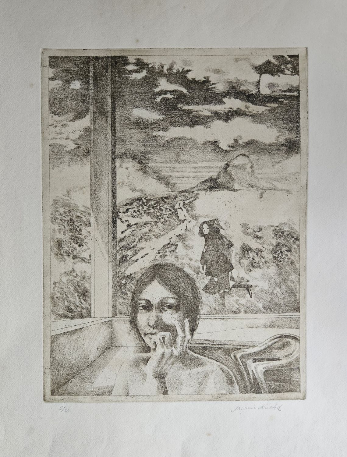 | Vernis mou, volný list vpravo dole autorem tužkou podepsaný, vlevo dole číslo tisku 2/50. Na rubu staré, zčásti setřené razítko Českého fondu výtvarného umění. |