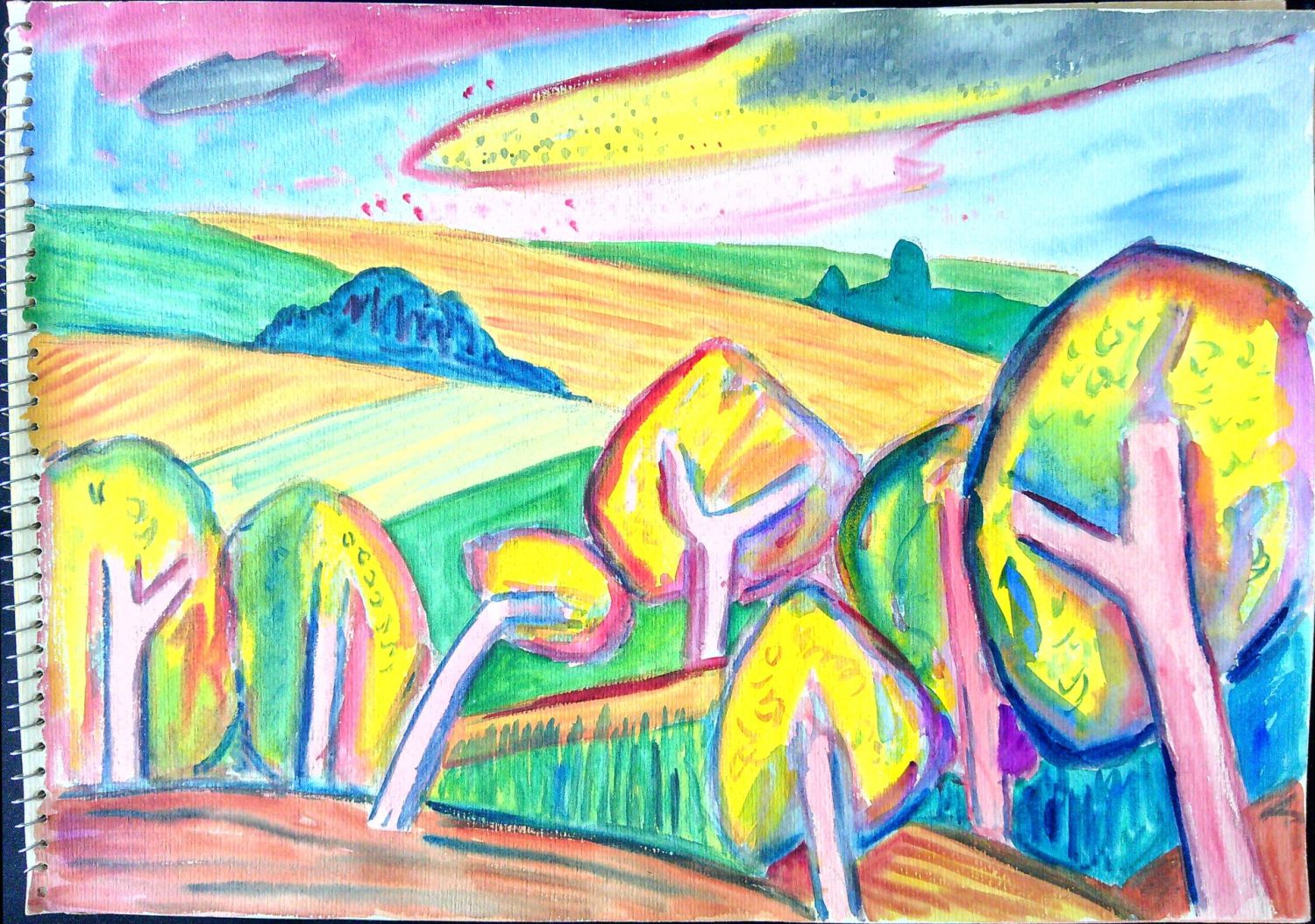 | Skicák s kroužkovou vazbou o rozměru 295 x 425 mm, který obsahuje 19 akvarelů Jaroslava Kafky (rozměr jednotlivých prací 295 x 410 mm).<br> 1. Turnov - Pelešany 1955/VII. 2. Pelešany - Turnov 1955/VII. 3. Pelešany - Turnov 1955/VII. 4. Turnov - Pelešany 1955/VII. 5. Z Pelešan - Turnov 1955/VII. 6. Turnov - Pelešany 1955/VII. 7. Pohled na Ještěd z Pelešan 1955/VII. 8. Pelešany - Turnov 1955/VIII. 9. Turnov - Pelešany 1955/VIII. 10. Pelešany - cesta lesem 1955/VIII. 11. Trosky - 1955/VIII. 12. Pelešany - Turnov 1955/VIII. 13. Pelešany - Turnov 1955/VIII. 14. Pelešany - Turnov - u Domácích 1955/VIII. 15. Pelešany - Turnov 1955/VIII. 16. Turnov - Pelešany 1955/VIII. 17. Žně na Telátkách (Kyselovsko) 1955/VIII. 18. Žně na Kyselovsku 1955/VIII. 19. Z Pelešan - Turnov. 1955/VIII.<br> Na rubu všech prací je rukopisný přípis "Maloval můj manžel Jaroslav Kafka .... L.[ída] Kafková". Na přední desce je autorovo označení skicáku III. 1955 22 l. VII-VIII. Pod ním přípis Kafkovy ženy "Z veliké radosti, kterou jste mi způsobili návštěvou u mne při příležitosti mých 75. narozenin, věnuji Vám oběma tuto upomínku na zemřelého Jarouška. Teta Lída". |