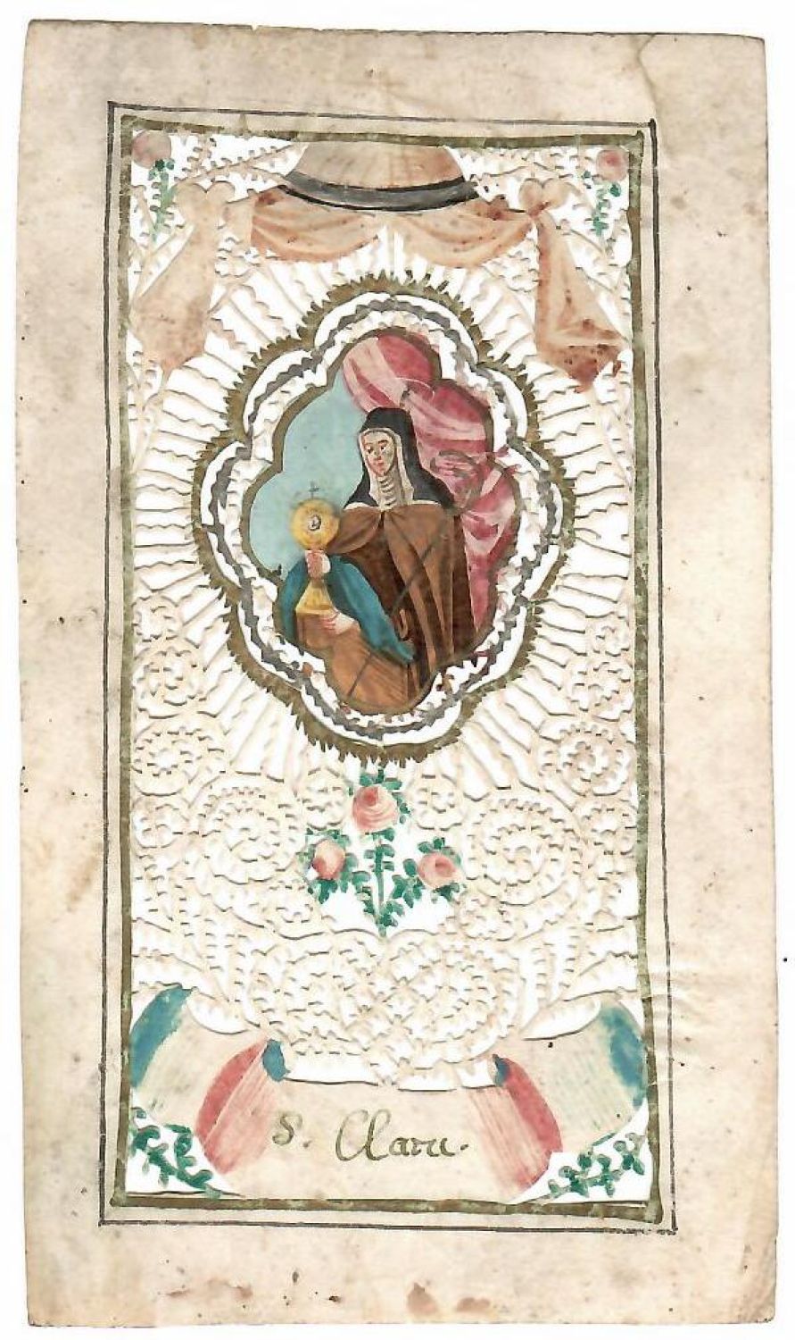 | Canivet v pergamenu s miniaturou v oválném medailonu s vyobrazením sv. Kláry. Pergamen lehce zašpiněný a při pravém horním okraji mírně pomačkaný. Canivet, druh svatého obrázku. Jemně ručně řezané či vypichované motivy imitující krajku obklopují miniaturu malovanou olejem, kvašem či akvarelem. V módě byly tyto obrázky především v 17. a 18. století a byly vyráběny především v ženských klášterech. Od poloviny 19. století řada tiskařských dílen začala canivety imitovat, krajkové ručně řezané či vypichované motivy však byly raženy strojově, proto se již o skutečné canivety nejedná. |