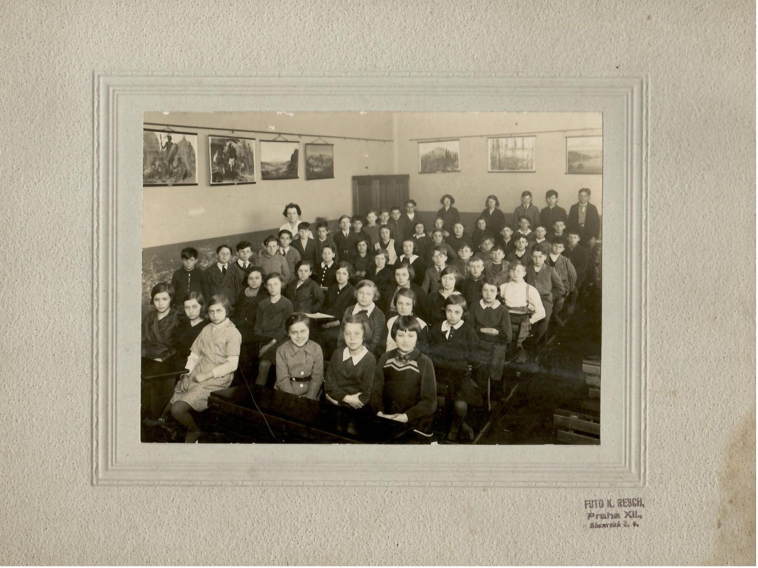 | Fotografie je namontována na karton. Při pravém spodním okraji razítko ateliéru "Foto K. Resch, Praha XII, Sázavská č. 6". Fotografie samotná lehce poškozena, karton drobně poškozen v levém spodním rohu, pravý spodní roh se žlutou skvrnou. |