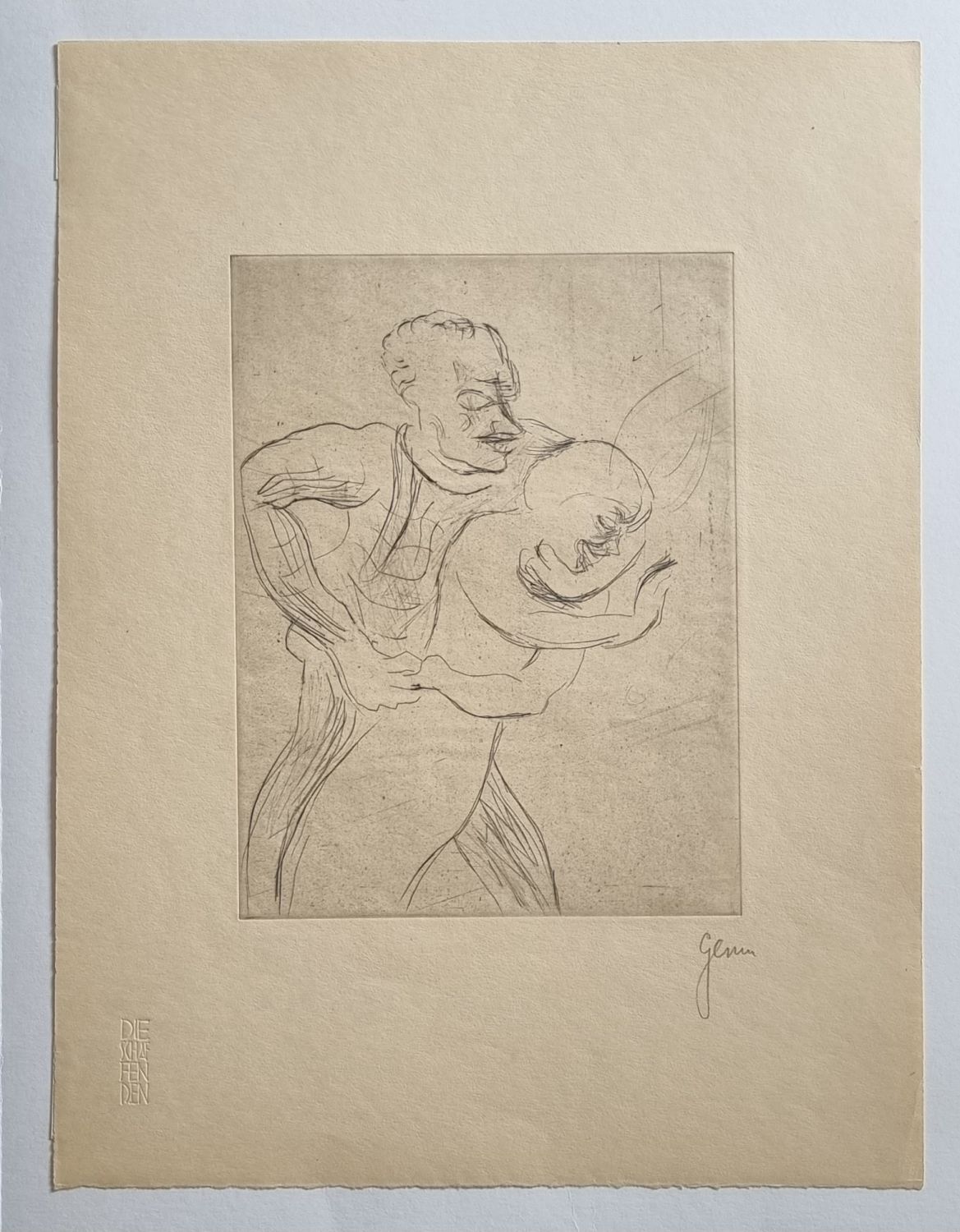 | Suchá jehla, vpravo dole autorem tužkou podepsaná, vlevo dole při spodním okraji papíru suché razítko "Die Schaffenden". Volný list, při levém okraji v rozích papírovou páskou přichycený k papírové paspartě. List vyšel jako součást alba Die Schaffenden (III. Jahrgang, Mappe 2, 1922), které bylo vydáno ve 100 exemplářích. |